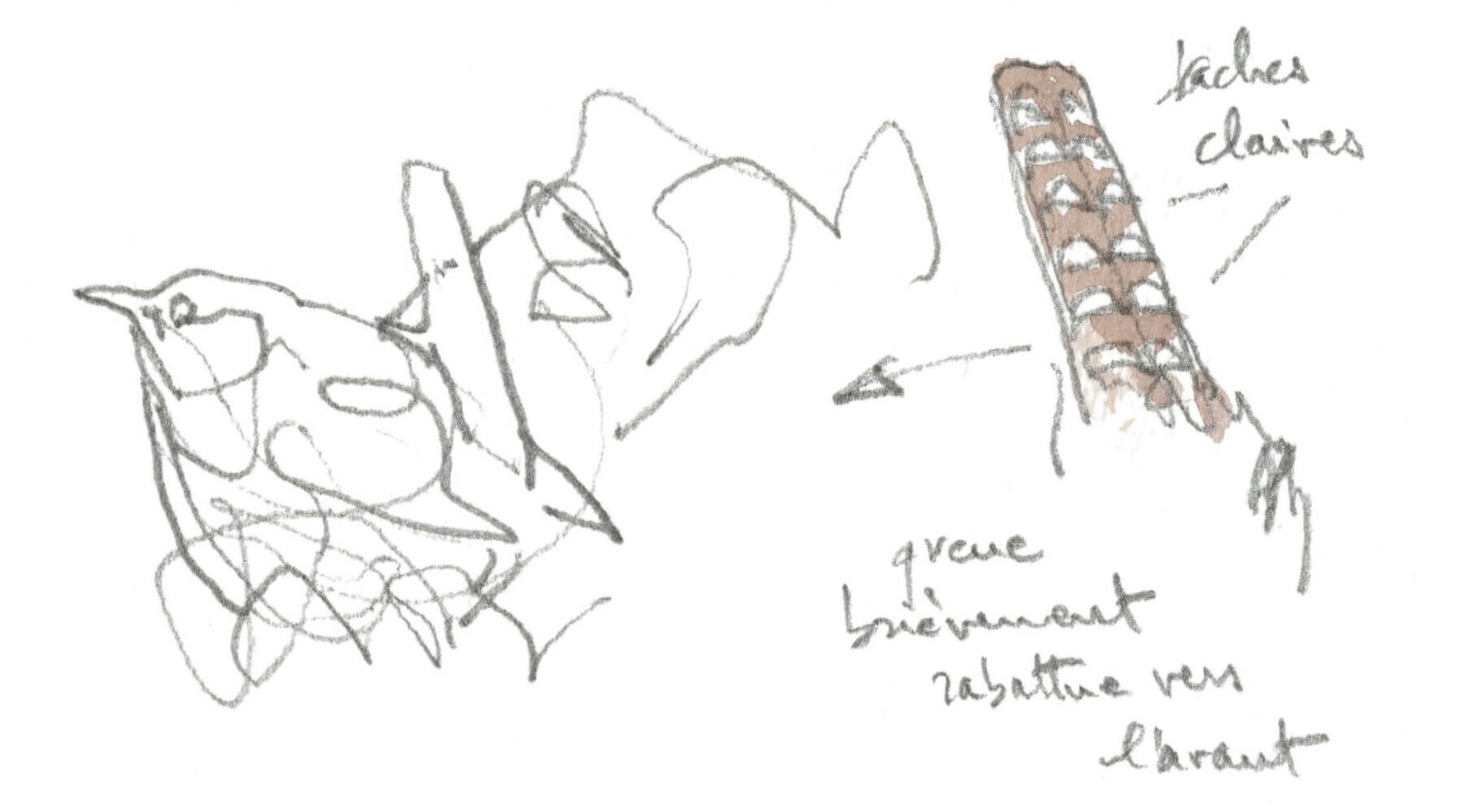Le troglodyte gagne la branche la plus basse d’un chêne. Semblant de toilette, tics saccadés. Profitez-en pour enfin lui tirer le portrait. Ventre cappuccino, dos cannelle agrémenté de fines barres sombres et sourcil crème. Il tient debout grâce à deux pattes fines comme des cure-dents plantés très en arrière du corps. C’est peut-être en relevant sa courte queue qu’il évite de piquer du bec.
