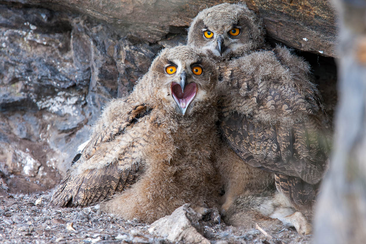 Les jeunes hiboux grands-ducs donnent de la voix au nid. La nuit, pour quémander la nourriture à l’arrivée d’un adulte. Et également pour se signaler quand ils ont l’âge de vadrouiller loin du nid. Mais les poussins papotent aussi régulièrement à l’aube et au crépuscule, semble-t-il, dans un pur esprit de cohésion familiale.