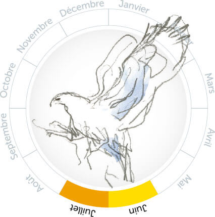 En juin et juillet, les parents profitent des premiers courants ascendants du matin pour s'élever haut dans le ciel. A deux, comme en février. Les oiseaux prospectent chaque recoin de leur territoire, recourant fréquemment au rase-mottes pour surprendre une marmotte inattentive. Au nid, leur rejeton a les crocs, il faut le sustenter. Et malgré sa puissance et ses redoutables techniques de chasse, l'aigle se loupe neuf fois sur dix.