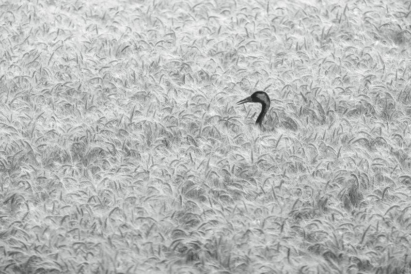 “Je rentrais chez moi après une séance photo au bord du lac. Depuis la digue près de la rivière, j’ai vu une famille de grues en train de se nourrir dans un champ de céréales. J’ai rapidement sorti l’appareil photo et, alors que les parents se tenaient déjà plus éloignés, j’ai réussi à photographier le jeune inexpérimenté.