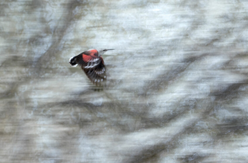 “Lors d’une randonnée dans les Alpes tyroliennes, j’ai observé un couple de tichodromes échelettes qui volait en permanence le long d’une paroi rocheuse, à proximité du chemin. Ils semblaient habitués à la présence humaine, j’ai donc pu attendre une occasion idéale pour photographier l’un d’entre eux.