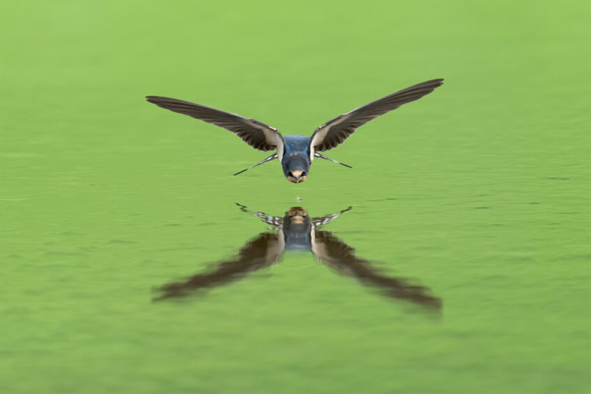 “Avec les fortes pluies estivales de 2021 en Suisse, un petit lac s’était formé dans un champ de maïs. Des hirondelles en ont profité pour se nourrir, s’abreuver et se baigner. Assis dans l’eau sur ma chaise de camping, j’ai pris des milliers de photos. Les cultures en arrière-plan donnent à l’eau une couleur verte. J’aime cette photo parce qu’elle est bien symétrique.