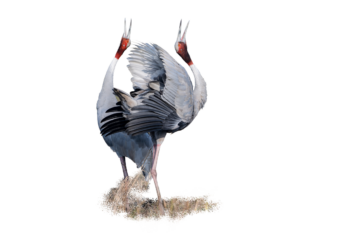- Oiseau porte-bonheur en Inde, parfois représenté en compagnie de Vishnou. Le poète légendaire Vālmīki décrivit sa tristesse de voir une grue endeuillée après que sa compagne fut chassée. Ce texte incarne le chagrin dans la littérature hindoue.
