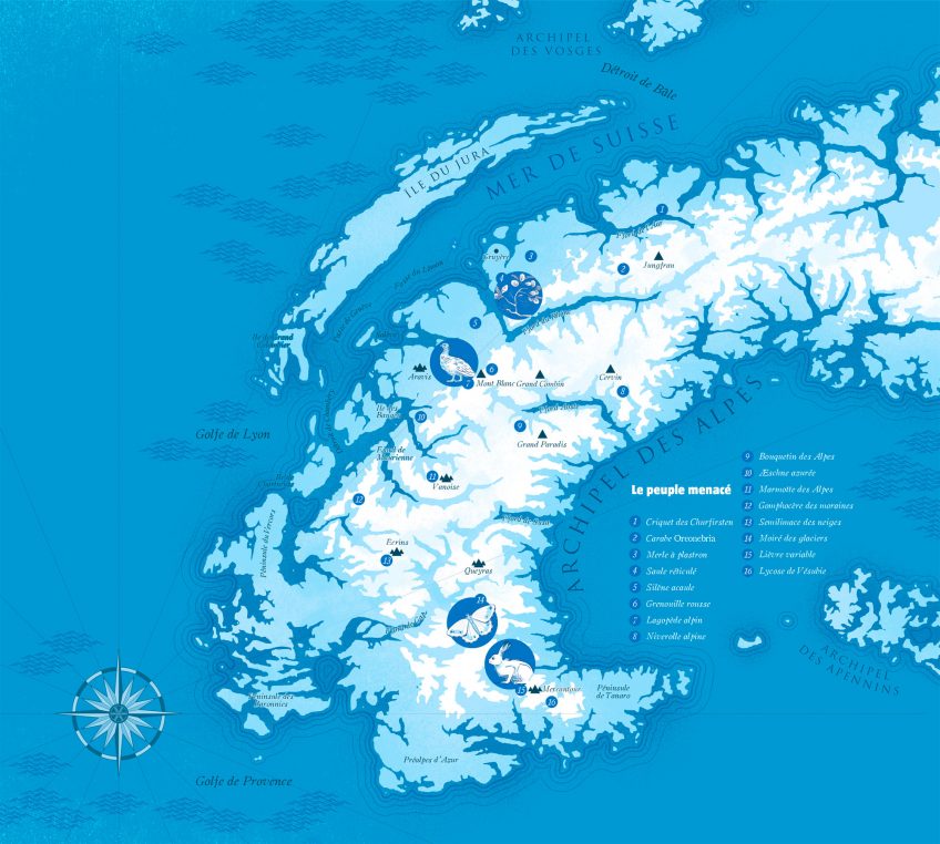 En général, plus on monte en altitude, plus la température chute, à peu près de 0,7 °C tous les 100 m. Ainsi, le relief alpin dessine-t-il un archipel du froid biologiquement isolé des étendues glacées du Grand Nord depuis la fin de la dernière glaciation. Actuellement, l’isotherme moyen du 0 °C en hiver, autrement dit la limite théorique entre la neige et la pluie, est à une altitude de 900 m (> carte ci-desous). Ce rivage théorique recouvre d’immenses étendues y compris l’ensemble des chaînes préalpines, les crêtes du Jura et celles des Vosges. Sans changement drastique de notre part, cette limite atteindra une altitude de 1 800 m en 2100, réduisant pour moitié l’étendue d’un archipel unique.