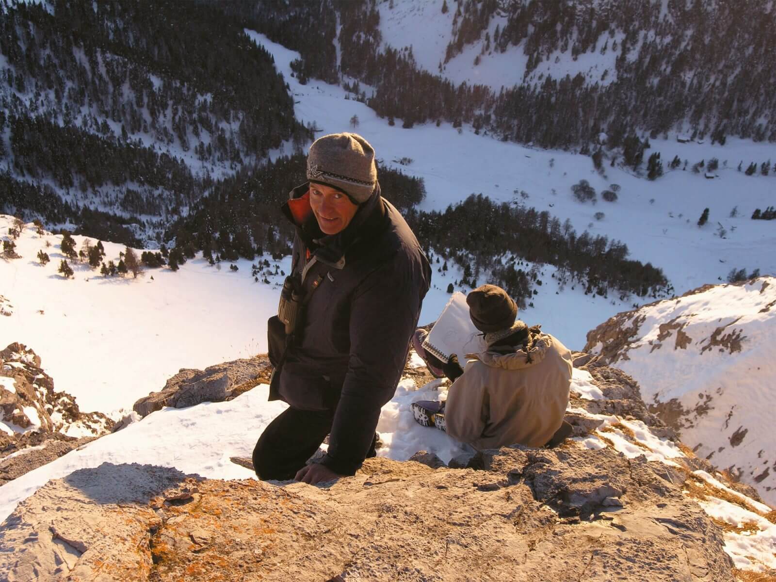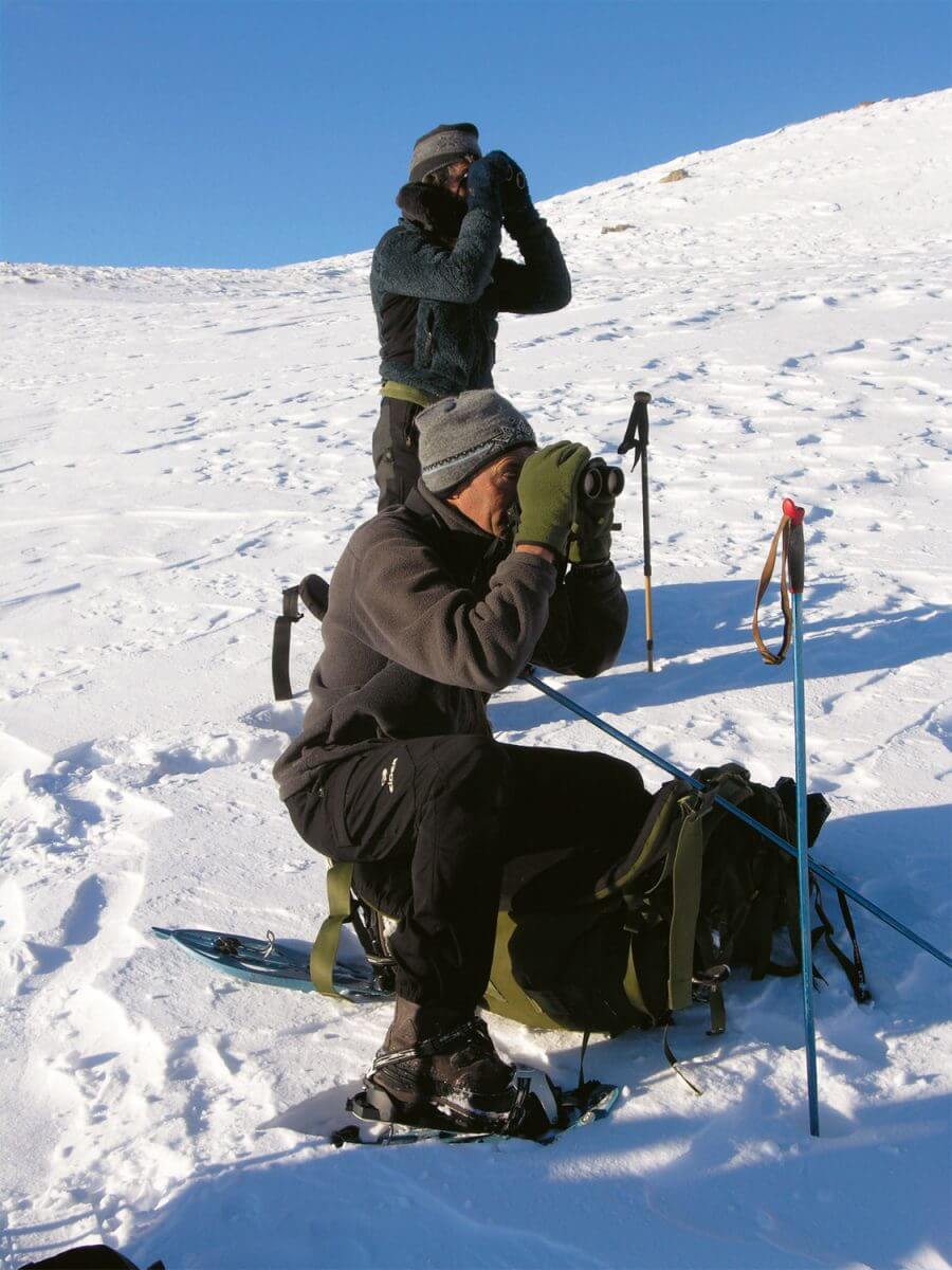 Nous observons les mâles se défier pendant des heures. Ils s’arrêtent parfois pour manger un peu de neige sans jamais se quitter des yeux. Ils gravissent les couloirs les plus raides, se poursuivent dans les rochers, flirtent avec le vide en reprenant toujours leur équilibre au dernier moment.