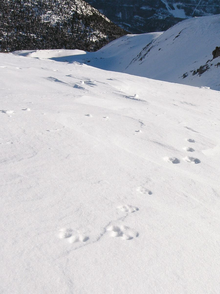 Plus nous montons, plus les arbres s’espacent. Bientôt, plus rien ne cache la découpe dentelée des montagnes, ni les paillettes d’argent qui illuminent le ciel. Là où les derniers arolles rabougris marquent la fin de la forêt, nous nous arrêtons brièvement. Au-delà de cette limite, l’ombre bleue de la nuit s’ouvre sur le royaume du lièvre blanc, du lagopède et du bouquetin. Un royaume silencieux comme le cristal, un royaume vierge et dangereux.