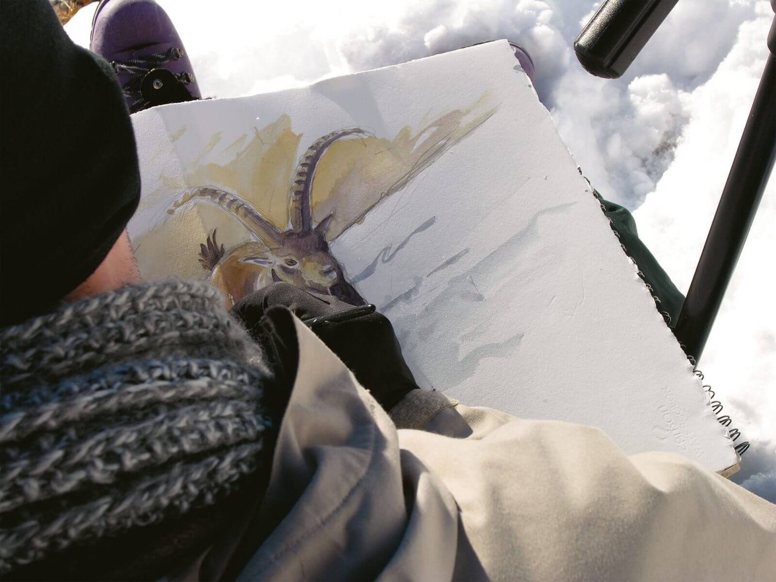 Nouveau départ avant l’aube. Cette fois, au lieu de contourner le massif rocheux par la droite, nous tentons une approche directe par en bas. Bonne idée : des bouquetins apparaissent partout au-dessus de nous, dispersés sur leurs châtelets de pierre séparés par des couloirs blancs. Nous sommes résolus à remonter l’un de ces corridors en zigzaguant pour arriver à la hauteur des grands mâles. Après une ascension difficile, on atteint finalement un replat au milieu des bêtes qui nous accueillent sans broncher.