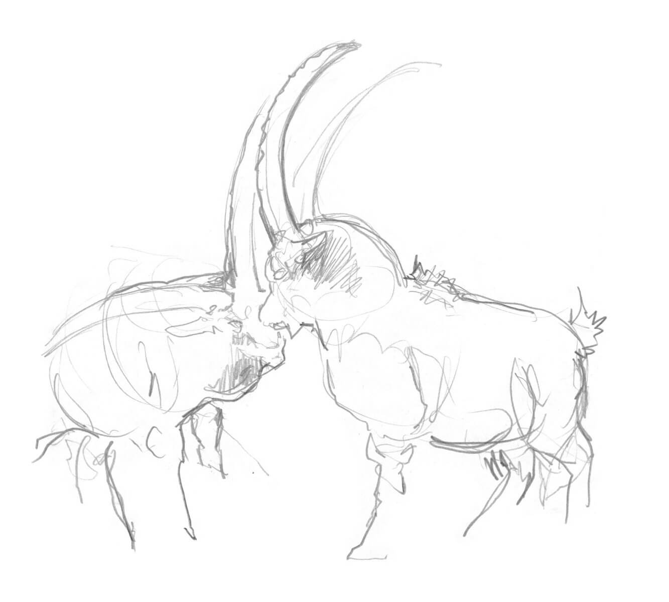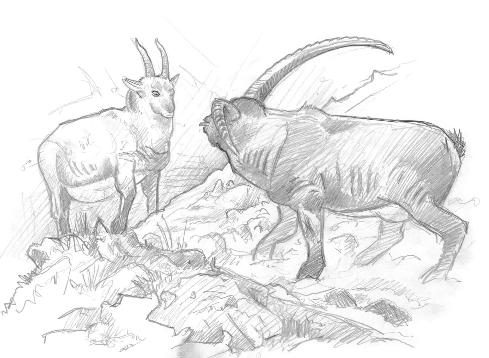 Nous descendons prudemment le long d’un escarpement entre rochers, touffes d’herbe et plaques de neige. Stop ! Un gros bouc se tient là, figé derrière une femelle en train de ruminer. Il tire la langue, lève la tête en arrière, tous muscles tendus. Après une longue attente, il bouscule l’étagne qui se lève et s’esquive en contrebas. Les deux bêtes ont disparu. Le soleil aussi. Mais l’un continuera à talonner l’autre, des nuits et des jours si besoin est, jusqu’à ce qu’elle consente enfin à quelques accouplements furtifs et le plus souvent nocturnes.