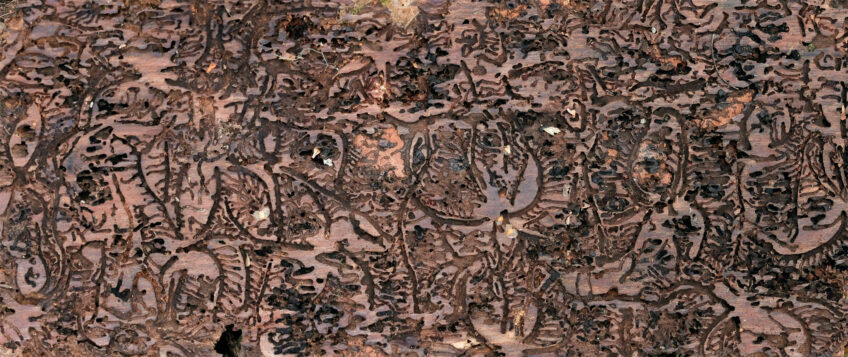 Aux concerts de Noël, la mélodie de l’épicéa donne des ailes... Eh oui, cette essence fournit les meilleurs bois de résonance des instruments à cordes, dont les célèbres violons Stradivarius. Les sapins en général sont aussi très recherchés par l’aviation, la menuiserie ou encore l’industrie de la pâte à papier pour leurs fibres claires et tendres, qui leur confèrent à la fois élasticité et résistance. Cette précieuse matière, les arbres n’ont pas intérêt à la partager, car elle leur coûte cher. En plus des humains, une myriade d’organismes l’apprécient. Les champignons décomposeurs en tête. Mais les plus redoutables sont les scolytes, de petits coléoptères qui forent des galeries sous l’écorce. Par exemple, le scolyte curvidenté chez Abies et le bostryche typographe chez Picea. Les sculptures creusées par les larves et les femelles se reconnaissent à leur forme de gros millepattes. Environ 200 scolytes doivent attaquer simultanément un épicéa sain pour parvenir à déjouer ses défenses. Si l’arbre est affaibli, ou en manque d’eau (> pp. 38-39), il ne peut plus produire de résine et la voie est libre pour les insectes. Leurs forages interrompent l’écoulement de la sève, parfois fatalement.