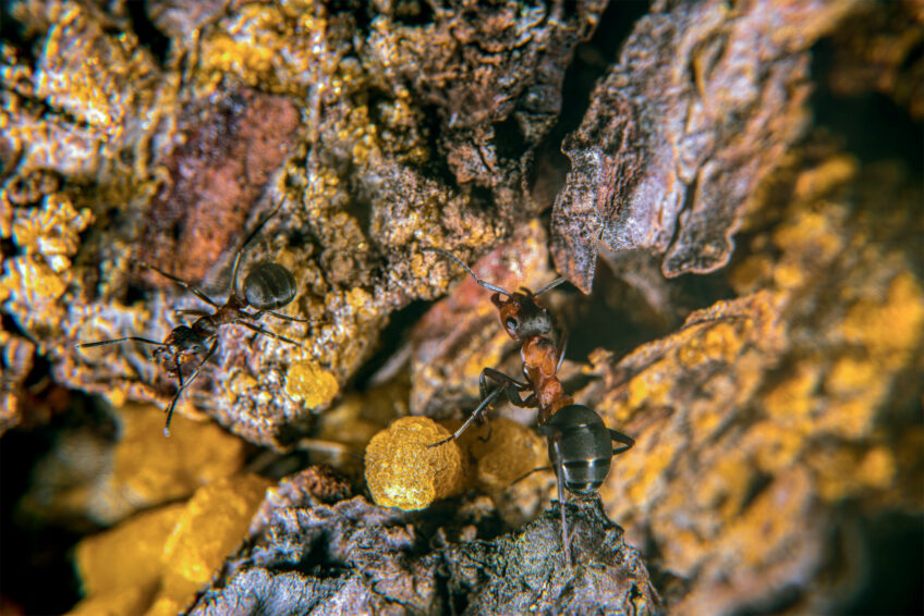 Foi de fourmi des bois, la poix a des vertus médicinales. Les ouvrières récoltent la résine en découpant de petites boulettes de quelques millimètres à partir des écoulements solidifiés sur les troncs. Elles les rapportent dans la fourmilière et les dispersent. Les émanations de ces billes aromatiques permettent aux adultes et aux larves de mieux résister aux maladies fongiques et bactériennes. Cette substance était également utilisée par nos ancêtres depuis des générations pour ses propriétés antiseptiques et expectorantes. Récoltée sur l’épicéa, on la nommait poix de bourgogne. Recueillie à partir des ampoules de résine du sapin blanc, c’était la térébenthine de Strasbourg. Au siècle dernier, ces résines ont servi de base à toute une industrie chimique pour réaliser des cosmétiques, produits d’entretien, adhésifs et autres peintures, avant de perdre du terrain face aux dérivés du pétrole. Aujourd’hui, l’industrie pharmaceutique fait encore usage de la précieuse matière.
