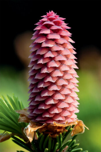 Des paillettes dorées dans l’air ? Un cadeau qui a tout pour plaire ! Entre mi-avril et mi-juin, dès qu’ils atteignent 30 à 40 printemps, les sapins produisent un grand nombre de petits cônes spéciaux au niveau des branches inférieures. Leurs délicates écailles jaunes portent des sacs qui libèrent dans le vent des nuées de pollen. Les minuscules grains se dispersent généralement dans un rayon d’une trentaine de mètres, mais une partie est emportée par les courants ascendants sur des dizaines de kilomètres. Suspendue dans les airs, cette fine poussière jaune se dépose parfois le matin en une pluie dite soufrée. Les arbres du voisinage captent au passage la semence de leurs cônes femelles tendus à bout de branches vers la cime (> photo ci-contre). Leurs écailles rouge carmin, d’abord ouvertes, se referment lentement après la rencontre. C’est à ce moment-là que, chez l’épicéa, les cônes s’inclinent vers le bas. Dans ce cocon nuptial, la magie de la vie opère. Le pollen n’ayant pas pu arriver à destination n’est pas perdu : il fait le festin de nombreux micro-organismes.