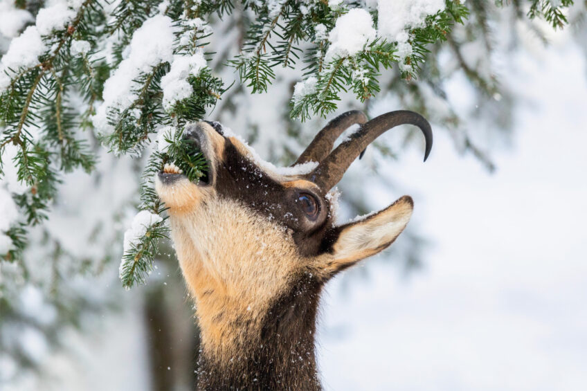 L’hiver venu, les feuillus sont tout nus. Et l’herbe rabougrie. Heureusement, pour de nombreux herbivores, il y a les résineux et leurs aiguilles éternelles. Tendres et vitaminées chez le sapin blanc, elles font de lui l’essence la plus broutée par les cervidés à la saison froide. Parfois, les arbres tendent leurs aiguilles, et c’est tout le rameau qui part sous la dent des cerfs, chevreuils, chamois ou lièvres... Perché dans les frondaisons, le grand tétras se nourrit à plus de 90 % d’aiguilles de conifères, sapin blanc en tête. Vous voulez votre part ? Prélevés avec parcimonie, les bourgeons et jeunes pousses sont réputés pour apaiser la toux et les rhumatismes en infusion, sirop, bonbon ou cataplasme. Si les remèdes de druide ne sont pas votre truc, essayez alors de fermenter les pousses en bière, comme s’y adonnaient les moines cisterciens, ou de les faire macérer en liqueur, la sapinette.