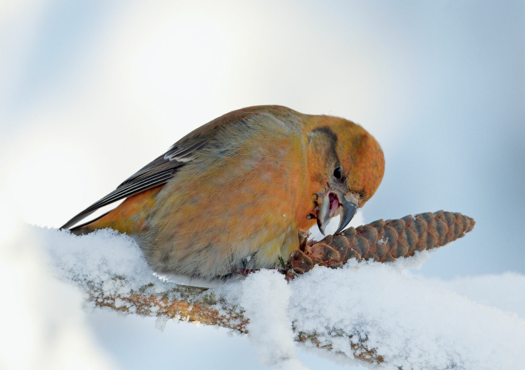 Le gras, c’est la vie ? Oh oui, répondraient les amateurs de graines d’épicéa. Chaque gourmet a développé sa technique pour les extirper de leur cône blindé. L’écureuil fait tourner la pive entre ses mains à mesure qu’il ronge frénétiquement les écailles pour accéder à la récompense. Mulots et campagnols font de même, mais de manière bien plus minutieuse et patiente. Le pic épeiche coince les cônes dans un repli d’écorce pour les marteler. Le bec-croisé est quant à lui passé maître en la matière. L’oiseau coloré glisse ses mandibules asymétriques sous les écailles et les soulève par un mouvement de levier afin d’extraire son repas avec sa langue. Grâce à cette ressource alimentaire parfois abondante toute l’année, il peut nicher même au cœur de l’hiver !