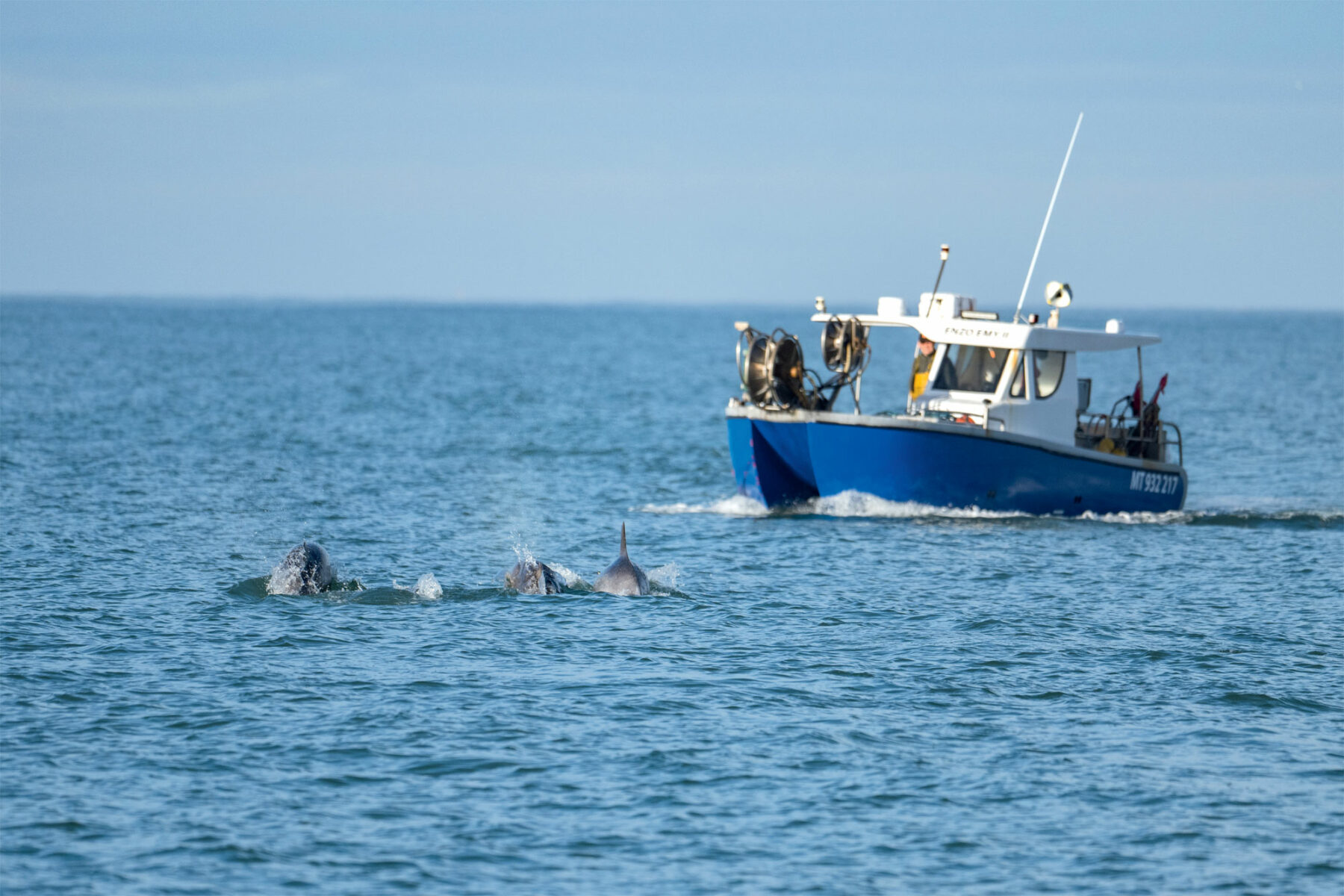 Un spécimen très démonstratif se propulse hors de l’eau. « C’est probablement une femelle gestante », me confie Hélène en regardant l’écran de mon appareil photo. D’autres nagent côte à côte et se rapprochent d’un petit bateau de pêche. « Ils doivent être en train de chasser », déduit la scientifique en pointant les poissons qui bondissent à la surface afin d’échapper à la gueule des prédateurs. Ces derniers ont beau être au sommet de la chaîne alimentaire, ils n’en demeurent pas moins vulnérables aux activités humaines. « Leur régime alimentaire piscivore et leur comportement opportuniste sont à l’origine de nombreuses interactions avec les activités de pêche. On estime que 30 % des blessures observées chez les individus échoués sont dues aux captures accidentelles », indique Hélène. Le chalutage de fond, qui consiste à laisser traîner un filet tiré par un bateau, peut aussi entraîner une diminution des ressources disponibles pour ces delphinidés. « Dans le golfe du Lion, les vastes étendues sableuses sont propices à de telles pratiques… », déplore-t-elle.