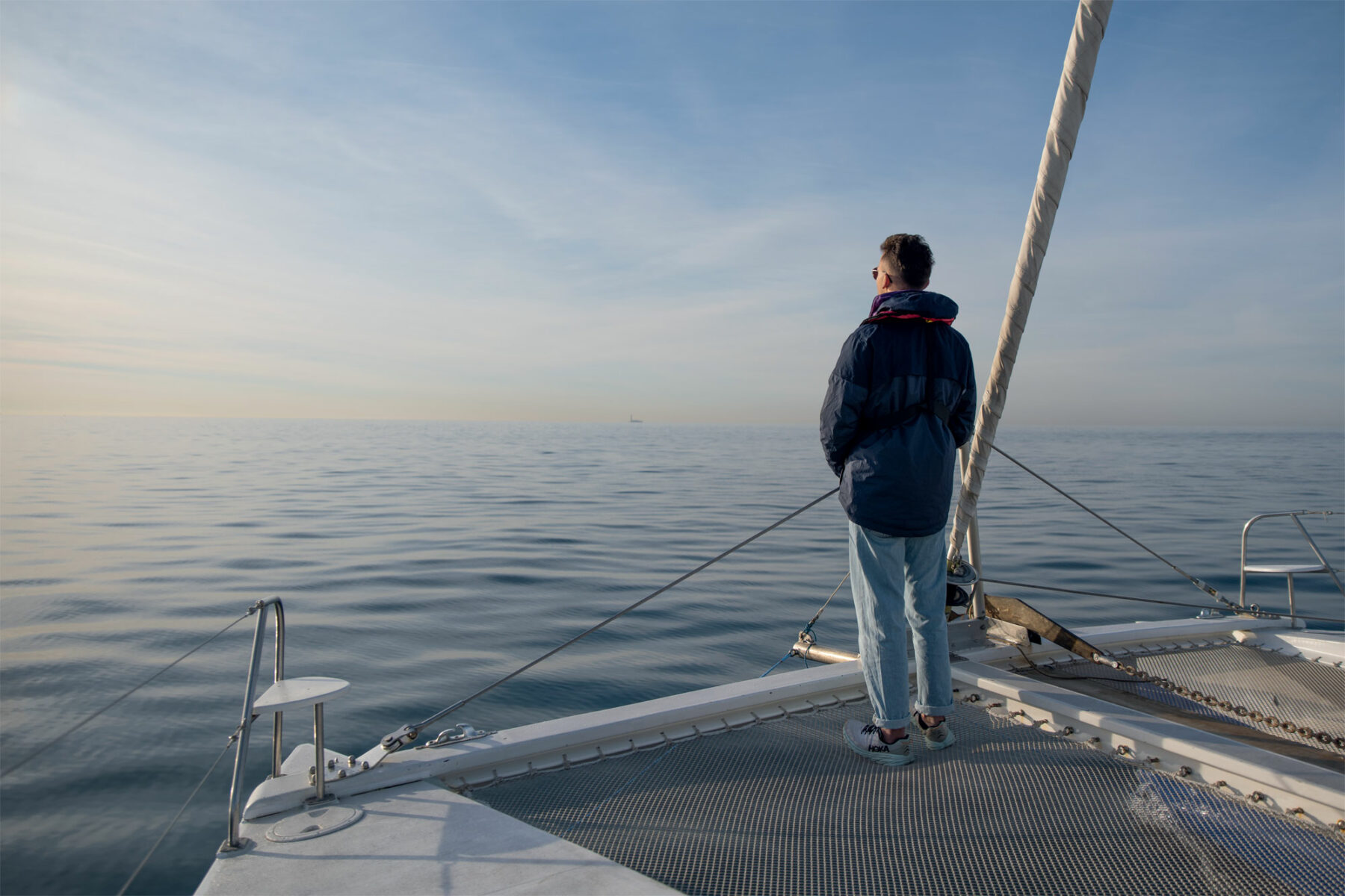 Samedi 8 mars 2023, 16 h. A mesure que je m’éloigne de la voiture, je vérifie mentalement ne rien avoir oublié. Crème solaire, sac de couchage, polaire, casquette… tout y est. Sac de randonnée au dos, j’ai plutôt l’habitude de prendre de la hauteur. Mais cette fois, il s’agit de prendre le large. « Le bateau s’appelle le Ti Blé, il est le long du quai, tu ne peux pas le louper », me dit Hélène au téléphone. Le port des Saintes-Maries-de-la-Mer, en Camargue, est désert. Pas étonnant pour la saison. Une multitude de mâts sont agglutinés aux abords de la capitainerie. Le vent frais dans les cheveux, je remarque les entrées maritimes responsables de l’épaisse couche de nuages texturés qui calfeutrent le soleil. Au bout du ponton, j’aperçois du mouvement sur un catamaran. A son bord, des scientifiques de l’association Miraceti se préparent en vue du départ imminent de l’expédition. Leur but est de chercher les grands dauphins pour mieux connaître les populations et ainsi mieux les protéger. Hélène Lambach, cétologue et directrice de l’association, m’accueille et me présente l’équipage. J’embarque à bord de leur univers. Nous serons donc sept paires d’yeux à guetter l’horizon. Départ prévu le lendemain très tôt après une nuit au port.