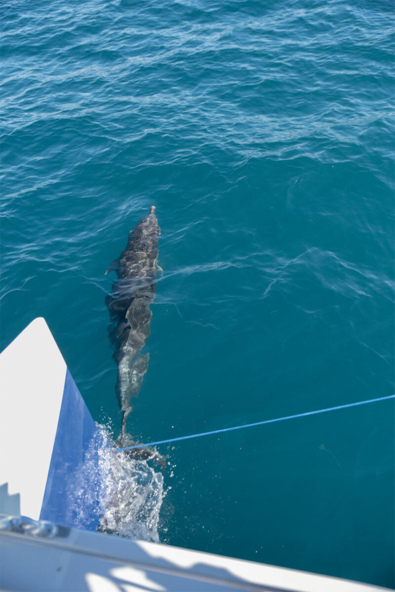 Sur le pont, l’effort débute. Il s’agit du terme utilisé pour le travail rigoureux qu’exige ce suivi. Claire et Hugo scrutent la surface à la recherche du moindre aileron suspect. Laurine se charge d’observer à la proue. Une mer d’huile et le soleil levant se dessinent au large.Quand soudain, après seulement quelques minutes en mer, Claire s’exclame : « Dauphin à bâbord ! » Une joie pour Tom, qui revient bredouille d’une semaine d’observation. Ni une ni deux, l’équipe bien rodée s’active. Jérôme vire de bord et approche précautionneusement le banc de huit dauphins qui ondule dans la zone. Nous comptons cinq jeunes d’âges différents grâce à leurs tailles variables. Munis de longs téléobjectifs, Laurine, Tom et moi photographions les ailerons des dauphins qui ressortent parfois à la surface. « On arrive à différencier les individus en fonction des détails visibles sur cette nageoire dorsale. Il faut une photo du côté gauche et une autre du côté droit. On les compare ensuite avec celles de notre banque d’images, pour identifier les dauphins et les groupes que nous avons vus par le passé, détaille Hélène sans quitter des yeux le banc qui s’éloigne. Cette méthode dite de capture-marquage-recapture demande un travail colossal, puisqu’on a déjà recensé plus de 1 500 individus. »