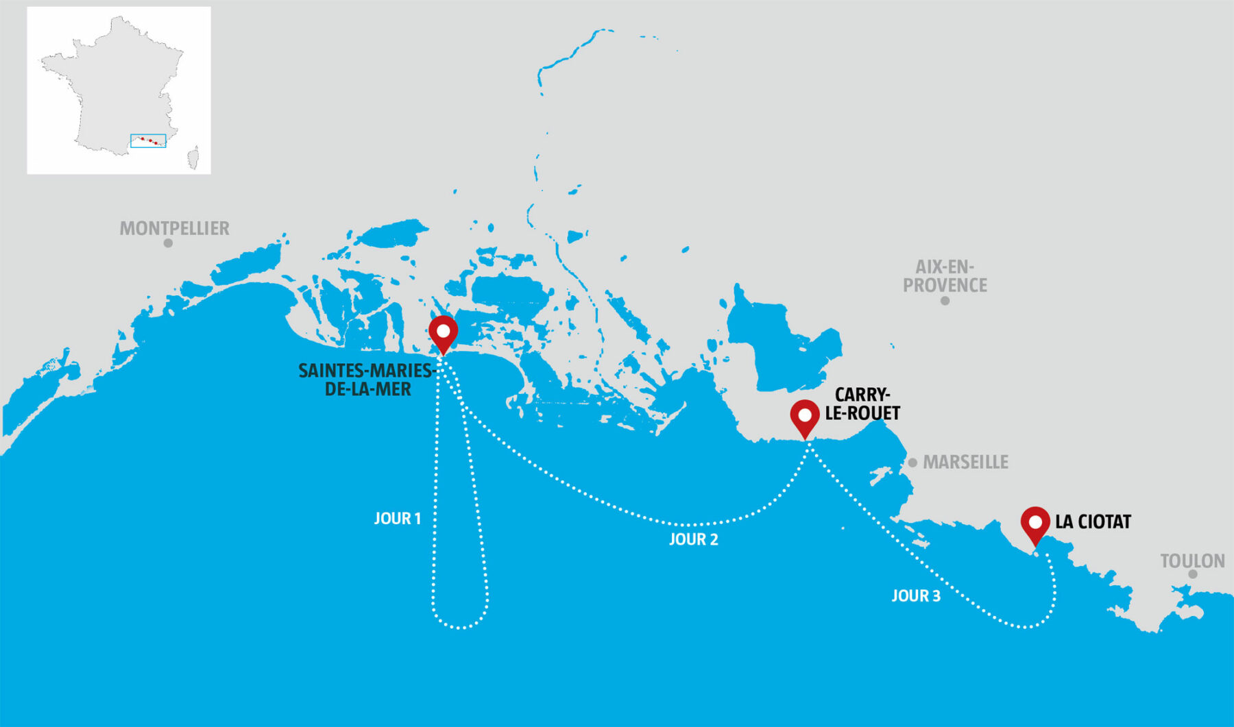 Lundi, 7 h 30. Départ pour la Provence, au large de Marseille. L’équipe souhaite prospecter dans un autre contexte géographique. Jérôme annonce huit heures de navigation jusqu’à Carry-le-Rouet, notre prochain port d’attache. Sur le chemin, le vent se lève et la mer se forme. Les conditions d’observation deviennent mauvaises et l’équipage passe en veille attentive. « On compte les moutons ! », plaisante Hélène, en référence à l’écume qui se forme à la crête des vagues. Jérôme hisse la grand-voile avec l’aide d’Hélène et Tom. Le bruit sourd des moteurs laisse place au chant du vent, dénué de toute interférence humaine.