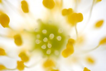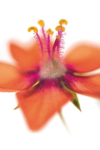 “Gros plan sur les parties intimes du mouron des champs. Le filet des étamines qui entourent le stigmate est pourvu de poils glanduleux : une défense contre les consommateurs éventuels du pollen contenu dans les anthères jaunes.