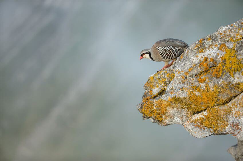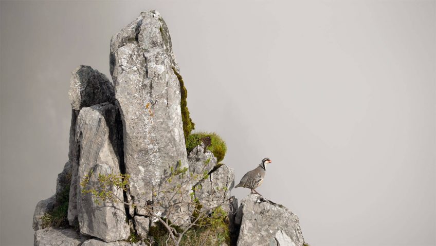 Partir à la rencontre de la perdrix bartavelle suppose de quitter la forêt et la lande à tétras pour gagner les adrets qui les coiffent. Là, quelques buissons nains parsèment encore la pente herbeuse traversée de couloirs ou d’éboulis. Sans être dominant, le minéral représente un élément clé. La bartavelle est de mœurs volontiers crépusculaires et s’anime surtout en début et en fin de journée. D’avril à juin, elle cacabe : posté en évidence, le mâle lance son chant pour marquer son territoire.
