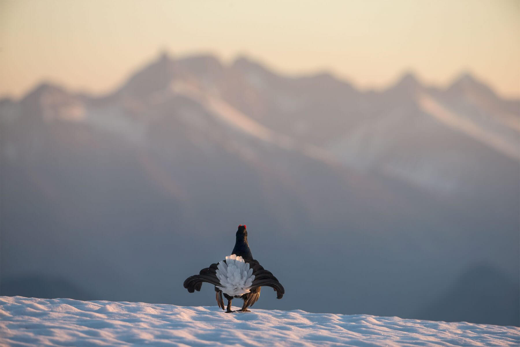 Courant avril, lorsque le printemps commence à dévoiler ses fastes dans les régions basses, l’hiver règne encore en montagne, en limite de forêt. Mais la belle saison se prépare. Il n’y a plus de temps à perdre pour les tétras-lyres. Les mâles sont aux avant-postes. Ils gagnent une arène occupée par tradition. Deux à dix, parfois jusqu’à vingt coqs peuvent la fréquenter, chaque individu occupant fidèlement sa position au cours d’une saison. Les dominants se réservent les meilleures places, laissant les jeunots s’exercer en périphérie.