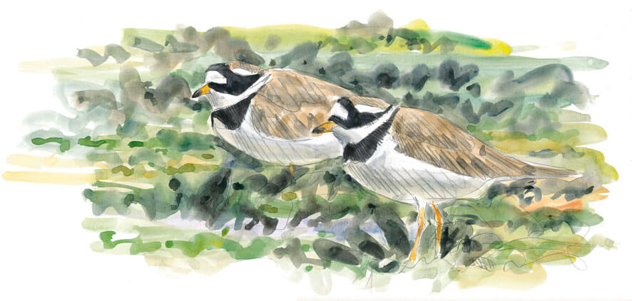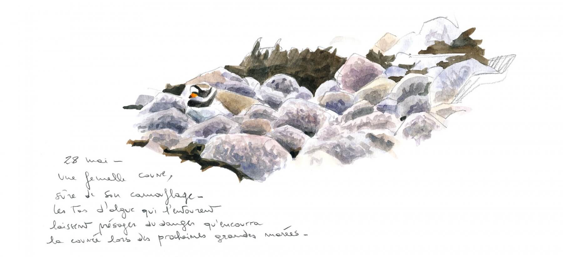 Après un festin s'étalant sur plusieurs jours, certains limicoles repartent vers le nord. D'autres s'accommodent des lieux et y fondent une famille, comme le grand gravelot. Le mâle de cet oiseau très nerveux, qui parcourt les plages en alternant pauses et marche rapide, parade en volant à faible hauteur et participe à la préparation du nid. Après avoir choisi un endroit dénudé en bord de mer, il creuse un trou dans le gravier et les débris de coquilles. La femelle le garnit de quelques débris végétaux ou de cailloux pour accueillir les œufs. Parfaitement camouflés, ceux-ci seront couvés par les deux parents en alternance pendant trois semaines.