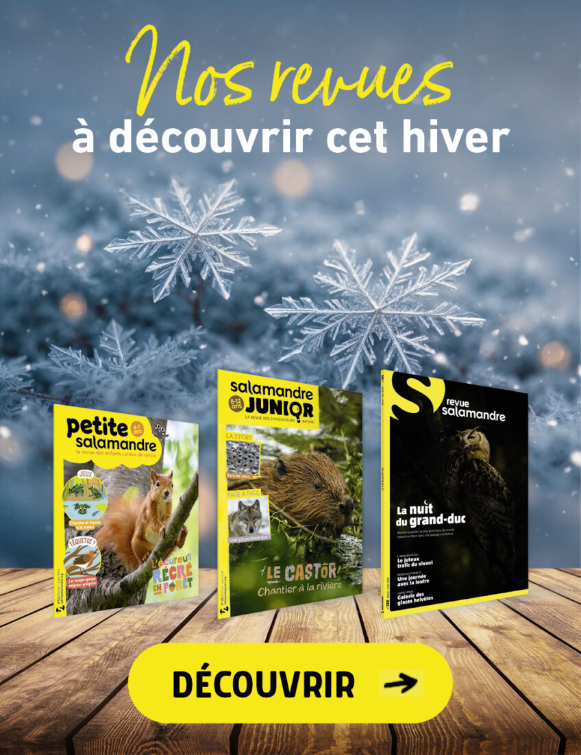 En février, la Revue Salamandre vous invite à passer une nuit au plus près du plus grand hibou du monde : le grand-duc. En ce début d'année également, la Salamandre Junior dévoile aux enfants de 8 à 12 ans les prodiges des castors, architectes de nos rivières. Quant à la Petite Salamandre, elle emmène les petits curieux de nature au sommet des arbres pour observer les acrobaties de l'écureuil.
