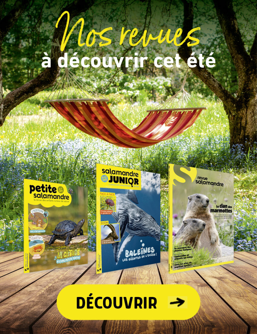 En ce début de période estivale maussade, la Salamandre vous invite à prendre du temps pour lire nos dossiers consacrés à trois animaux passionnants ! Nos rédacteurs se sont rendus en montagnes pour mieux connaître le mode de vie méconnu de la marmotte, véritable icône des alpages. Vos petits curieux de nature vivront des rencontres incroyables avec un numéro de la Salamandre Junior dédié aux géantes de l'océan, les baleines, et un numéro de la Petite Salamandre sur la cistude, tortue de nos régions.