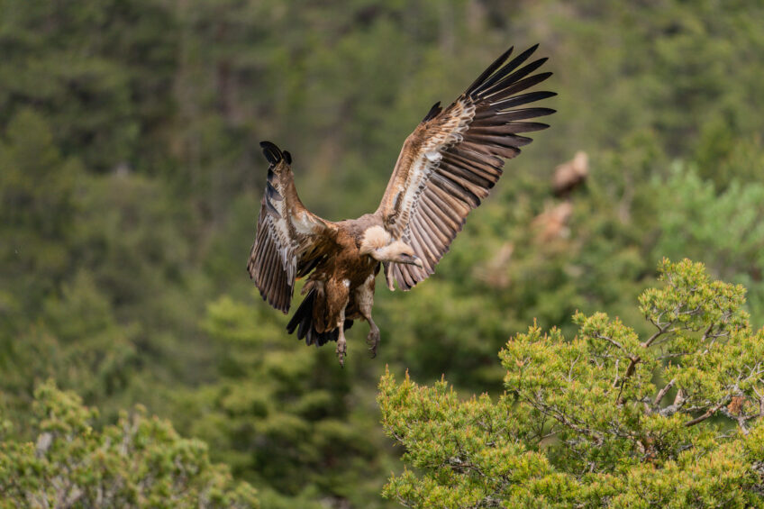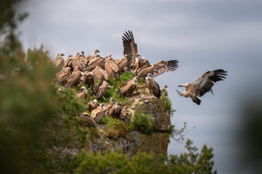 Tour à tour, ils se perchent sur un gros rocher, jusqu’à manquer cruellement de place. Il y en a plus de 50. Au bout d’une demi-heure, une centaine d’oiseaux saturent l’espace aérien au-dessus de la placette. Après un essai raté sur le perchoir collectif, certains atterrissent maladroitement sur la cime des arbres alentour. Robert, un salarié de la LPO en charge de collecter les carcasses issues des troupeaux des éleveurs, actionne une poulie à distance qui dépose le corps de la première brebis. Aussitôt, les vautours posés déploient leurs ailes, tandis que les autres descendent du ciel. C’est le début de la curée, terme qui désigne le repas des vautours.