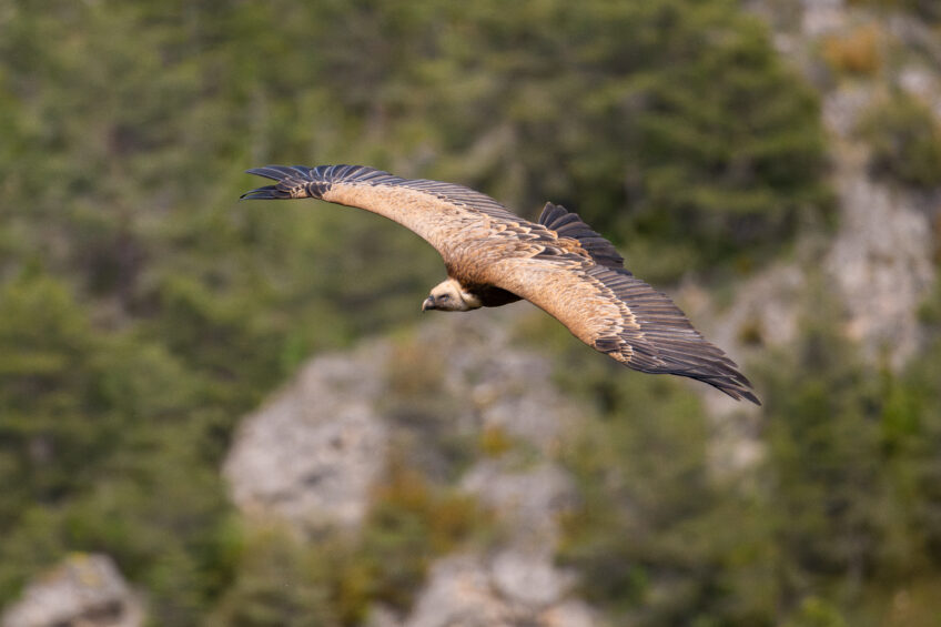 En contrebas d’une petite route forestière discrète, en haut des gorges, un point d’eau, quelques pins sylvestres et un tas d’os se détachent du paysage. Des vautours fauves arrivent. « Ils ont repéré que quelque chose va se passer », lance Léa Giraud. Toute la journée, ces oiseaux dotés d’une acuité visuelle excellente planent à la recherche de cadavres sur des centaines de kilomètres. Mais, aujourd’hui, l’emplacement du déjeuner leur est familier.