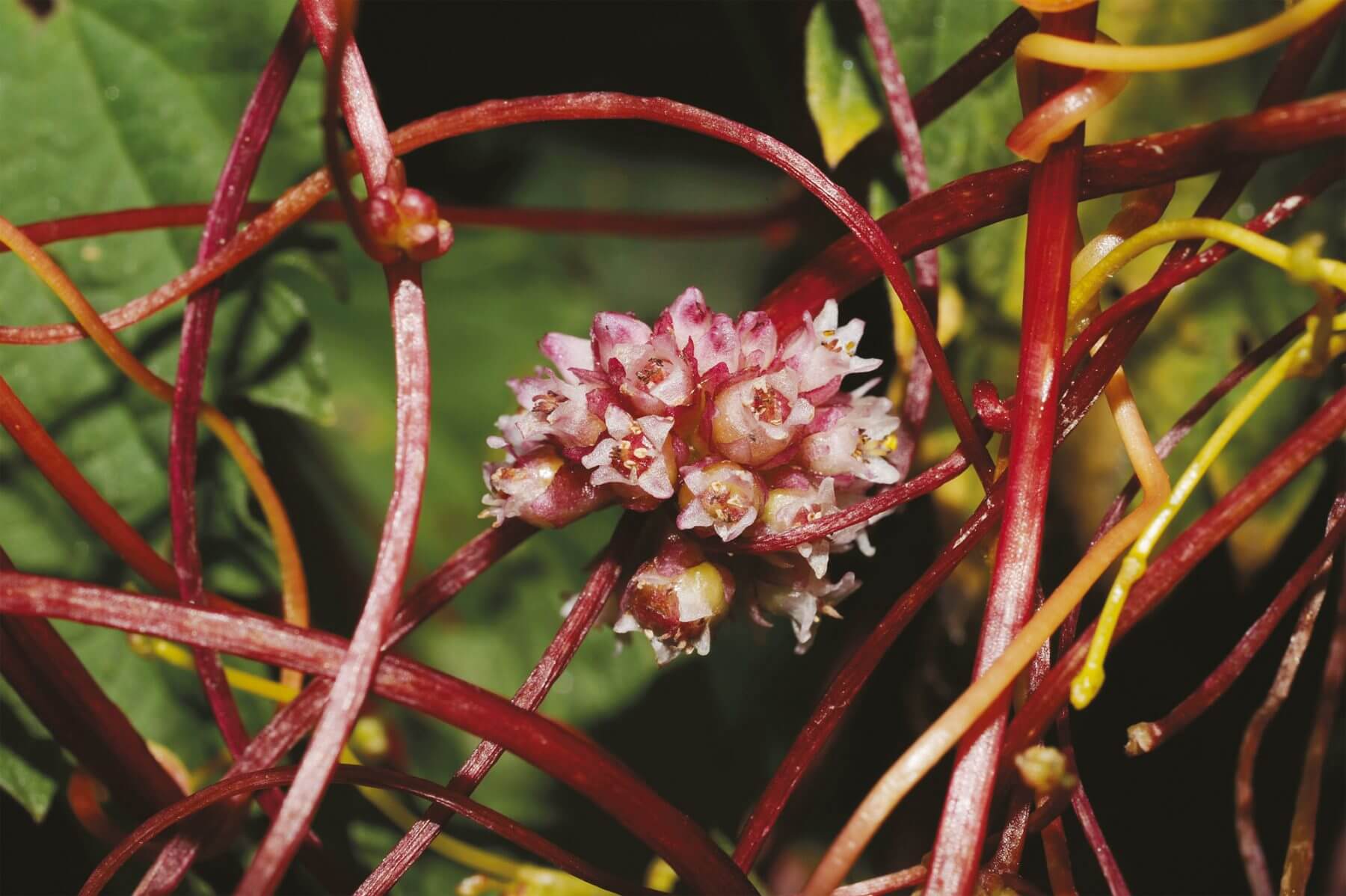 Dépourvue de chlorophylle, la cuscute se nourrit en parasitant d’autres plantes. Une fois installée et entretenue par un hôte qui fournit sucre, eau et sels minéraux, elle se laisse vivre, enfin. Car les débuts sont périlleux. La jeune plantule, limitée par les réserves de sa graine, doit trouver rapidement une tige où planter ses suçoirs.
