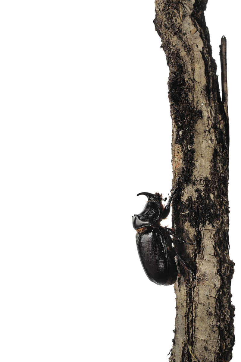 Petit à petit, les intempéries et les filaments des champignons ramollissent le bois. Alors, le tronc du hêtre pourrissant attire plusieurs sortes de coléoptères noirs qui pondent leurs œufs dans le bois vermoulu. Parmi ces cousins du grand lucane cerf-volant qui vit sur les chênes,le plus spectaculaire est l’étonnant rhinocéros. Chez cet animal au corps cylindrique, le mâle porte un appendice sur le front qui fait irrésistiblement penser au profil d’un gros mammifère cuirassé…