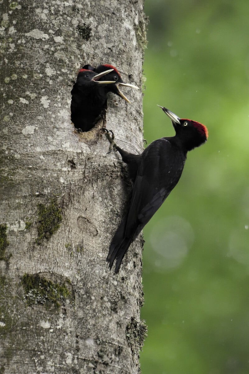 Ce que le pic noir préfère par-dessus tout, c’est un beau fût de hêtre. Peut-être l’absence de branches latérales lui offre-t-elle un dégagement apprécié. Dans le Jura en tout cas, c’est son arbre quasiment exclusif. Ailleurs, en l’absence de foyard de taille convenable, le pic noir peut s’installer dans un tronc d’épicéa ou de sapin blanc, plus rarement de pin, de mélèze ou d’érable. Si la cavité déprécie évidemment la valeur économique de son porteur, elle ne semble pas accélérer fondamentalement sa décrépitude.