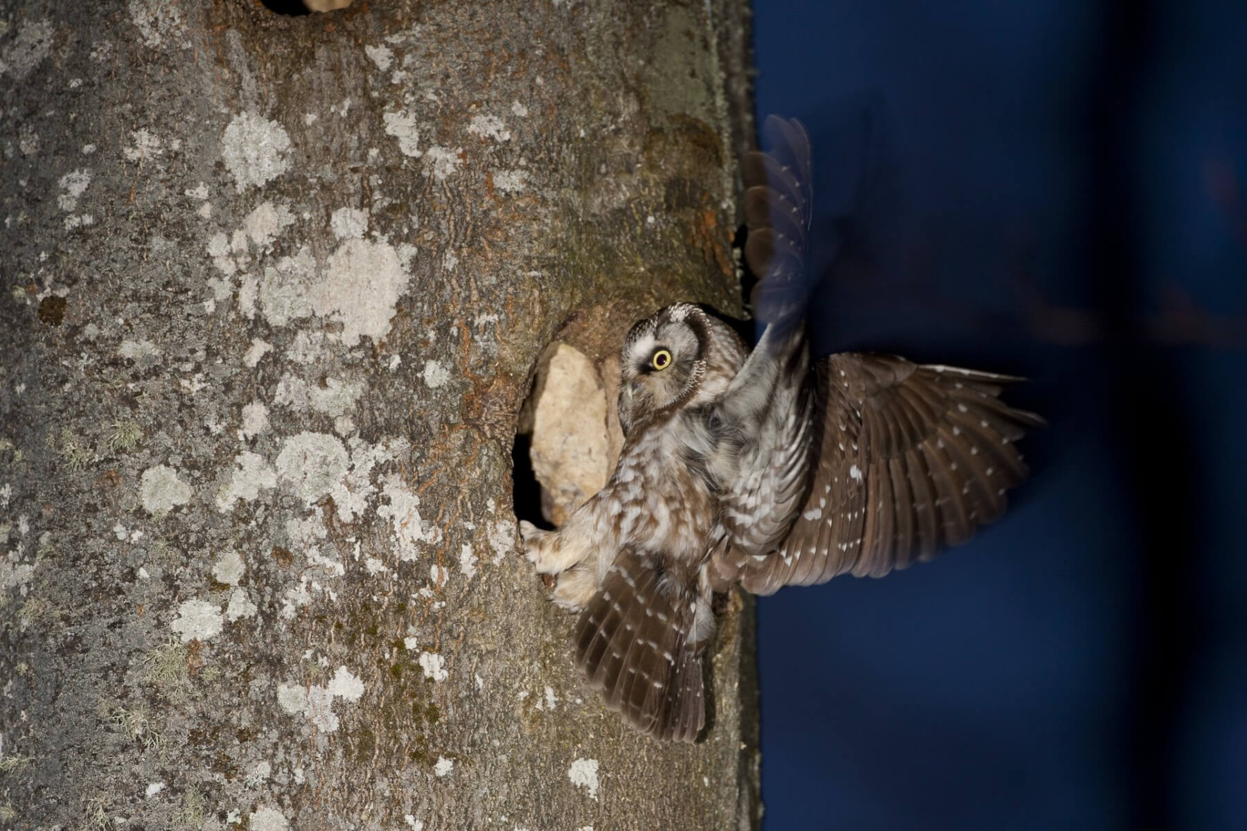 Une abondance de rongeurs entraîne une excellente reproduction chez tous les rapaces nocturnes forestiers, tout particulièrement chez la chouette de Tengmalm. Cet oiseau discret s’est adapté d’une manière originale à ces alternances d’abondance et de disette. Le mâle est très sédentaire. Chaque fin d’hiver, son chant flûté résonne dans une hêtraie-sapinière de moyenne montagne. La femelle en revanche est une opportuniste voyageuse. Elle peut parcourir des dizaines, voire des centaines de kilomètres à la recherche d’une forêt riche en mulots. Dans ce cas, elle commence à élever une nichée avec un premier partenaire, puis déguerpit avant la fin du nourrissage pour fonder ailleurs une seconde famille avec un autre partenaire. Quand la saison est bonne, il faut produire un maximum de jeunes ! Et s’il n’y a pas grand-chose à manger ? Madame s’en va ailleurs. Et Monsieur survit en croquant de maigres musaraignes et quelques oiseaux.