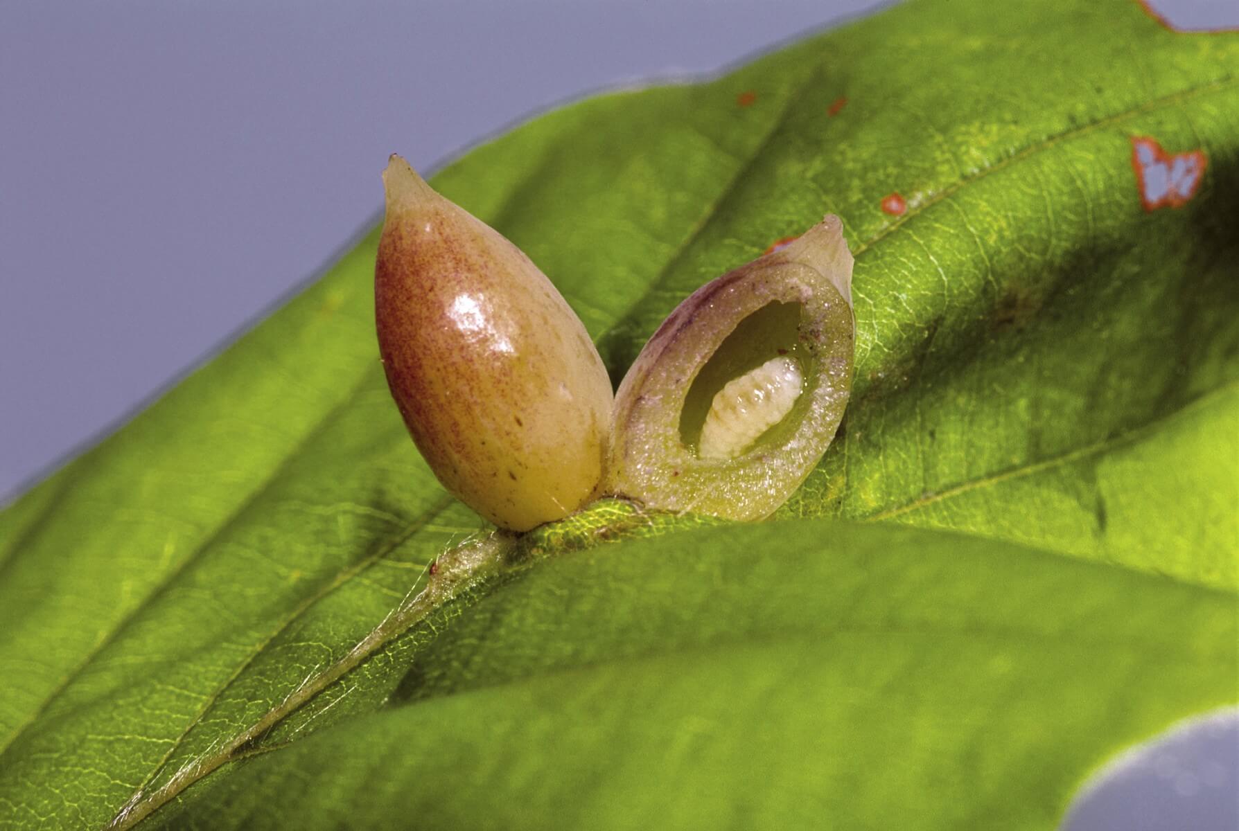 En été, on voit parfois apparaître sur certaines feuilles de hêtre des excroissances en forme de petits citrons. Ces galles sont provoquées par la ponte d’une minuscule mouche appelée Mikiola fagi. La présence d’un œuf, puis d’une larve dans le tissu végétal induit le développement d’une espèce de petite maison creuse. En automne, la galle se détache et tombe par terre. La nymphe de la mouche passe l’hiver abritée à l’intérieur avant d’émerger au printemps suivant.