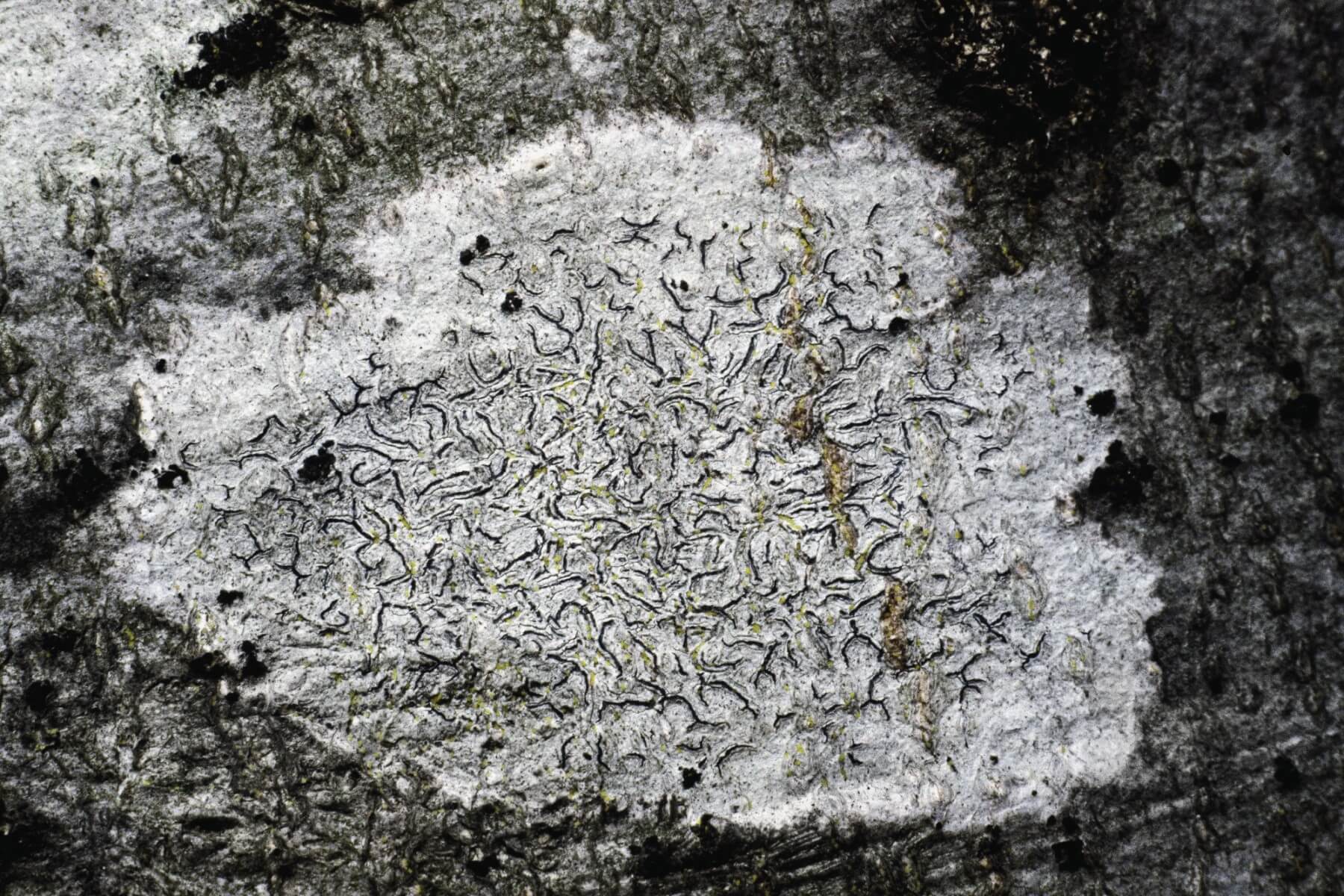 De loin, on dirait de simples taches blanc crème sur fond d’écorce grise. De près, voici Graphis scripta, un lichen crustacé caractéristique du hêtre et d’autres arbres à écorce lisse. Rapprochez-vous encore et vous verrez à la surface de cet être presque plat de curieuses lignes noires irrégulières, parfois divisées en trois ou quatre branches. Appelés lirelles, les organes reproducteurs de ce lichen dessinent comme un alphabet ancien évidemment illisible. Si on savait déchiffrer ces lettres sylvestres, sûr qu’elles nous raconteraient des histoires délicieusement croustillantes…
