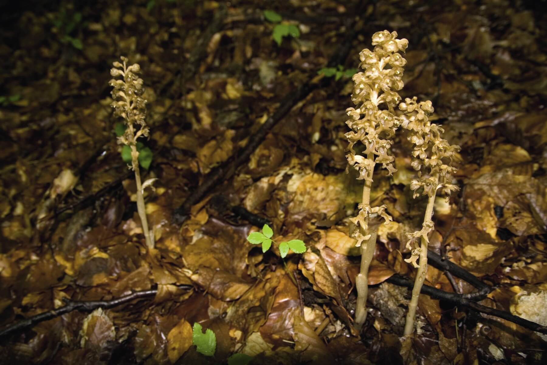 Pour vivre sous des hêtres, il faut avoir des besoins en lumière modestes. Pas de problème pour la néottie nid d’oiseau, une orchidée sans chlorophylle capable de pousser dans une obscurité complète. D’abord, la néottie se développe avec très peu de ressources ou fleurit sous terre certaines années par mesure d’économie. Et surtout, cette plante connecte ses racines aux filaments d’un champignon qui vit lui-même en symbiose avec le hêtre. L’arbre fournit des sucres à ses deux partenaires. Le grand réseau racinaire du champignon complète l’approvisionnement de l’arbre comme de l’orchidée en eau et en sels minéraux. Et enfin la néottie profite des ressources de l’un comme de l’autre... semble-t-il sans réelle contrepartie.