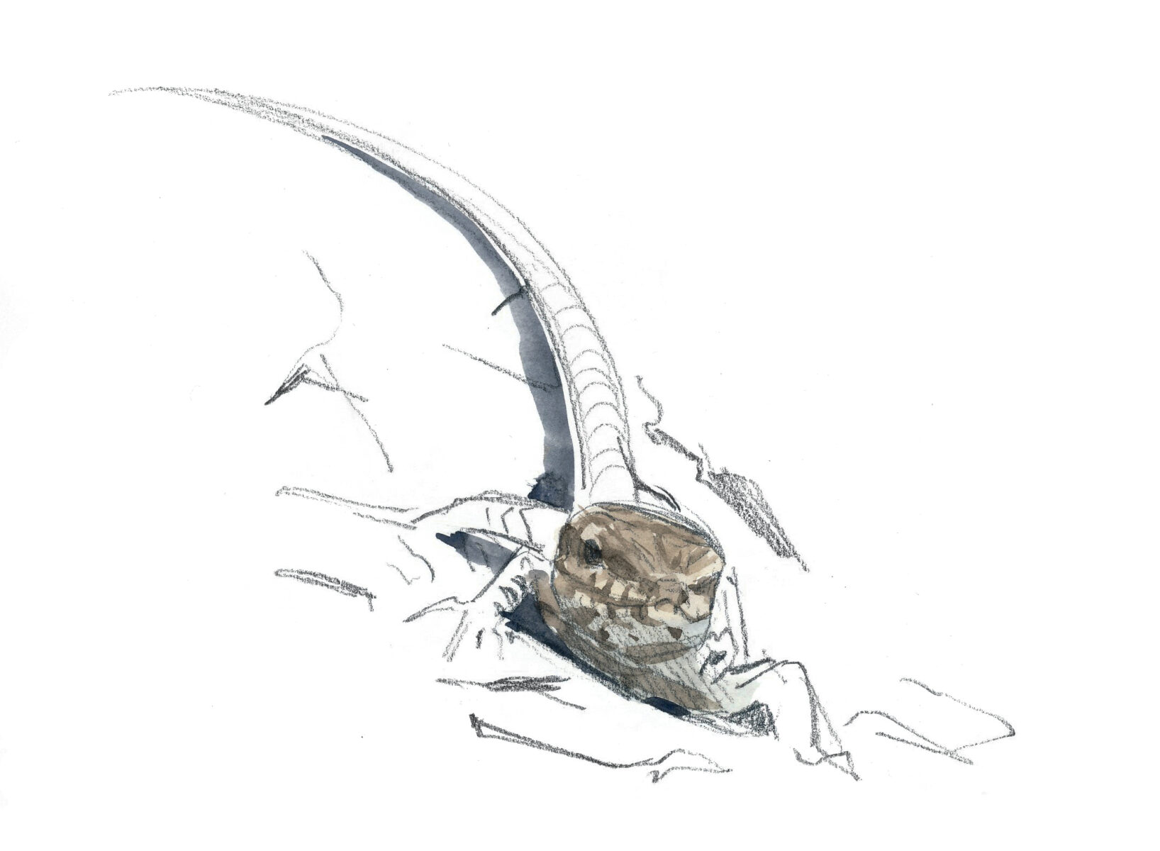 C’est un petit mouvement de fuite détecté du coin de l’œil qui stoppe net ma montée d’escaliers quatre à quatre. Mais la bête a déjà disparu dans le mur. Il suffit d’attendre… ça bouge à nouveau ! D’abord un museau, puis des lèvres aux taches noires verticales qui dessinent presque des dents. Et voilà son œil brillant, cerclé d’un iris feu et surligné d’une arcade sévère. Puis le tympan noir et ovale, suivi d’un cou épais recouvert de minuscules écailles. Seule la patte avant gauche s’avance, avec ses longs doigts frêles et griffus. Elle semble prête à propulser le petit dragon dans sa cachette à la moindre alerte.