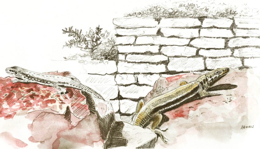 Il ne faut pas se fier à la posture mi-nonchalante mi-altière de ces reptiles. Ils sont en réalité sur le qui-vive et guettent les dangers venus du ciel et surtout le chat domestique, terreur des jardins.