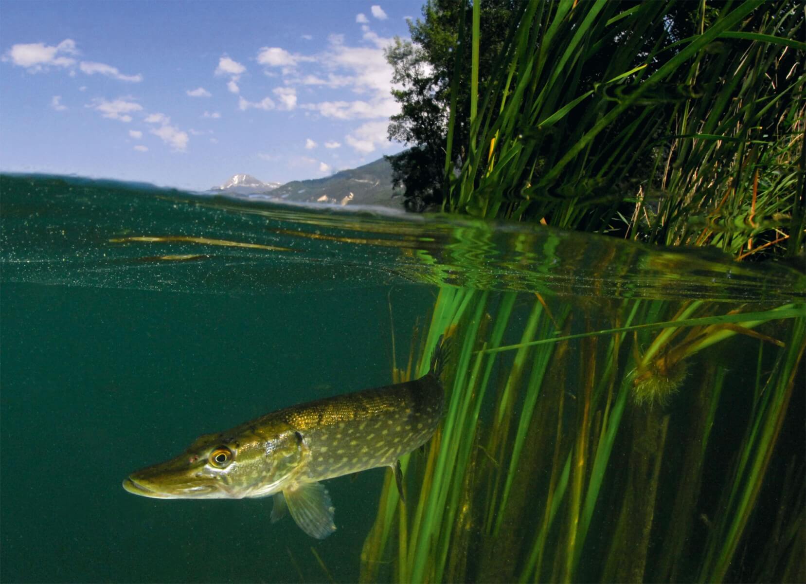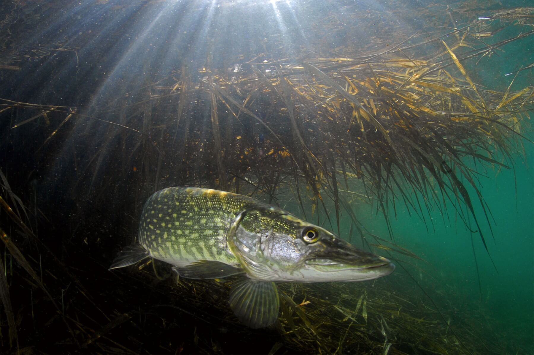 Selon l'heure de la journée, elle n’a pas la même attitude. En plein jour, elle se tient souvent à l’affût ou parcourt lentement les herbiers en quête d'un repas. Pendant ces périodes de chasse, elle se laisse moins facilement approcher. Je la respecte et garde mes distances… Grâce à ces précautions, j’ai pu immortaliser des scènes extraordinaires de brochets avec une proie dans la gueule.