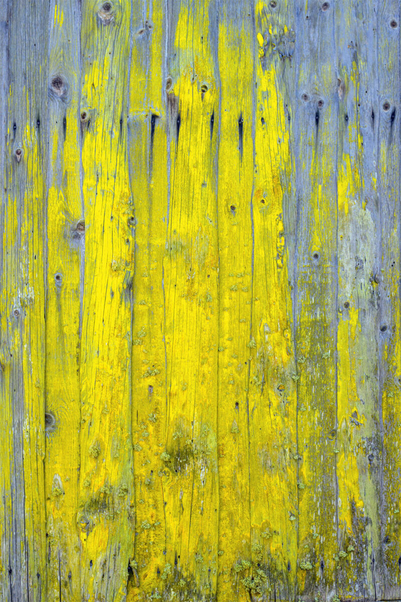 Lichen lépreux jaune (Chrysothrix candelaris) et touffes de Ramalina sp. sur des planches d’épicéa dans un village - Haute-Savoie.