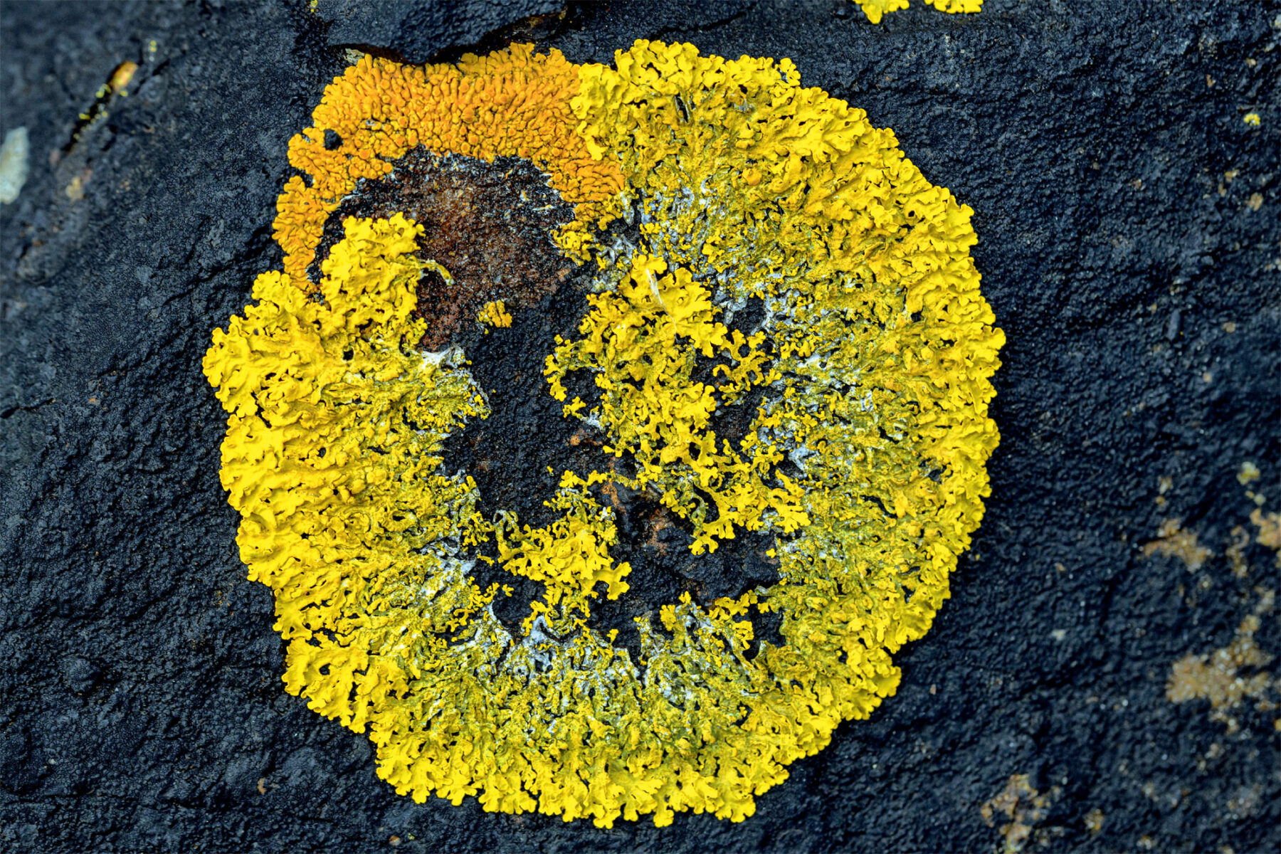 Xanthoria aureola (jaune), Ramalina siliquosa (fruticuleux gris) et Ochrolechia parella (blanc) sur fond noir d’Hydropunctaria maura (lichen crustacé ressemblant à du pétrole), presqu’île de Crozon - Bretagne.