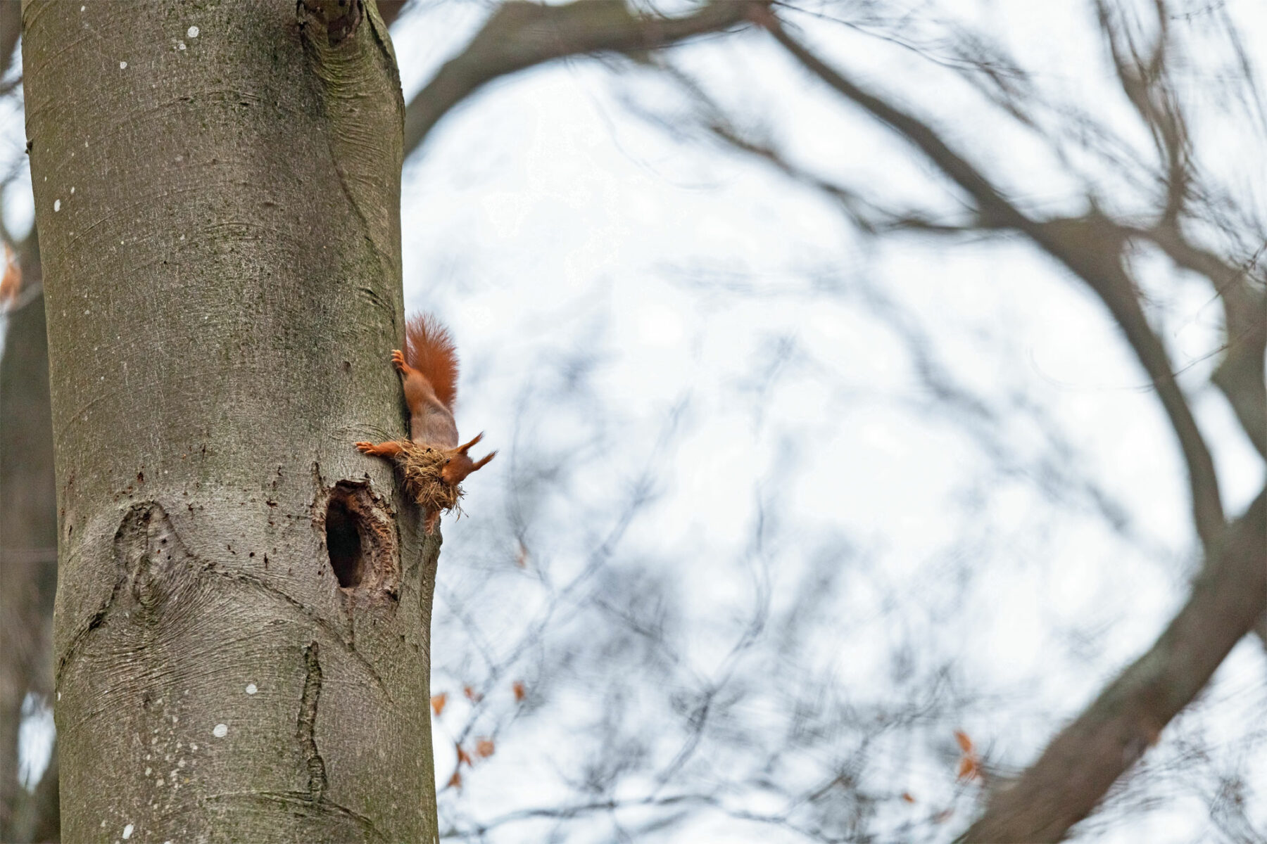 Après quelques jours de patience, la nature semble décidée à me faire un cadeau. A l’aurore, entre deux giboulées, je me tiens immobile, assis contre une souche depuis plus d’une heure. La tête levée vers la cime, j’observe soudain un écureuil roux qui saute de branche en branche, puis d’arbre en arbre. Sa gueule déborde d’herbes sèches, de feuilles et de mousse. Je scrute ses déplacements jusqu’au hêtre qui fait l’objet de toute mon attention. Le voilà qui descend le long du tronc et se dirige vers la résidence du pic ! L’endroit semble parfait pour y faire un nid. Après avoir déposé les végétaux dans la loge, il répète son manège.