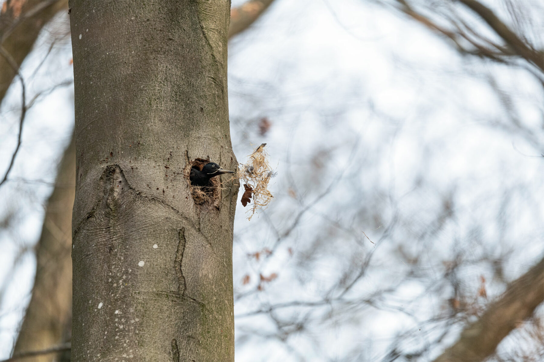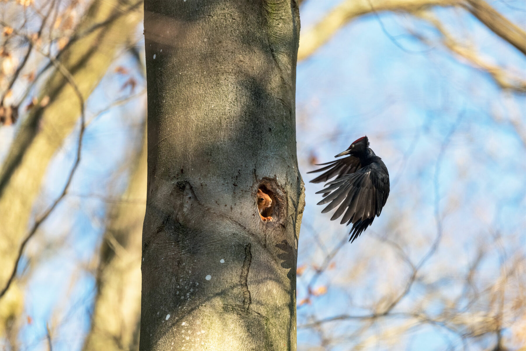 Atteignant 70 cm d’envergure, le pic noir est le plus grand représentant européen de la famille des picidés. Habitant des vieilles forêts, il niche principalement dans les hêtres. C’est vers l’âge d’un siècle environ que ces arbres atteignent le diamètre de 1,30 m, minimum requis pour abriter la nichée d’un tel oiseau. On estime que chaque jeune pic consomme 50 000 à 60 000 insectes durant son séjour au nid.