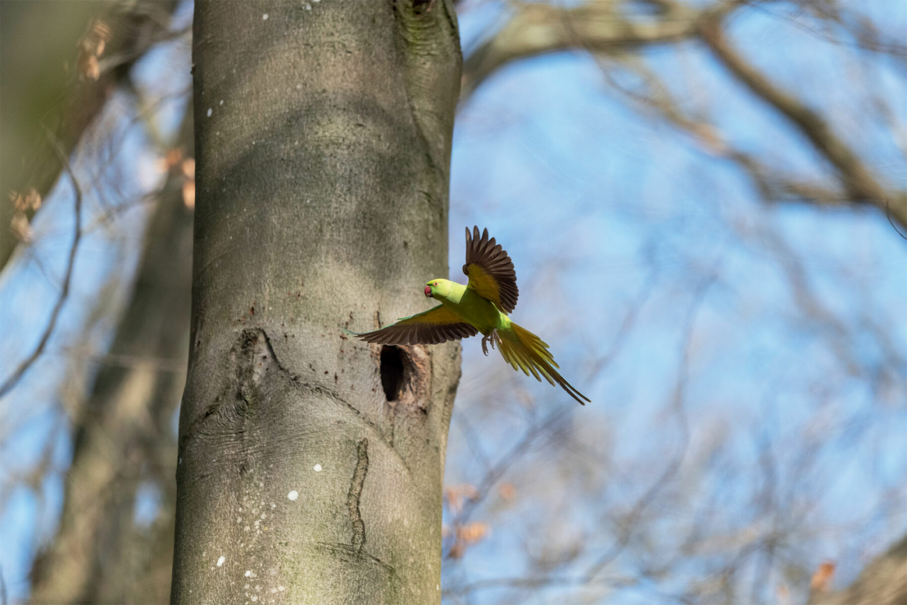Ses allers-retours se suivent et se ressemblent, jusqu’à ce que le maître des lieux entre en jeu. Alors que le rouquin s’apprête à sortir de la loge, une silhouette sombre de grande envergure arrive droit sur lui. Coiffé d’une calotte rouge écarlate, c’est le mâle de pic noir qui se presse à l’entrée. L’appareil photo fixé sur mon trépied, j’étais prêt pour saisir cette rencontre insolite. Clic, clac, c’est dans la boîte ! L’oiseau s’accroche alors près de la loge, ses griffes ancrées dans l’écorce. Appuyé sur les plumes rigides de sa queue, il tente d’intimider le rongeur. L’écureuil finit par fuir mais revient peu après, apportant à nouveau des végétaux. Cette fois, c’est lui qui tombe face à face avec l’oiseau, qui a profité de l’absence du squatteur pour dégager le nid en construction. Avec le renfort bienvenu de la femelle, le couple parvient à chasser définitivement l’occupant pour reprendre possession de la cavité. Une petite heure plus tard, trois perruches à collier tournoient bruyamment à proximité. L’une de ces exotiques verdoyantes tente une intrusion, sans succès.