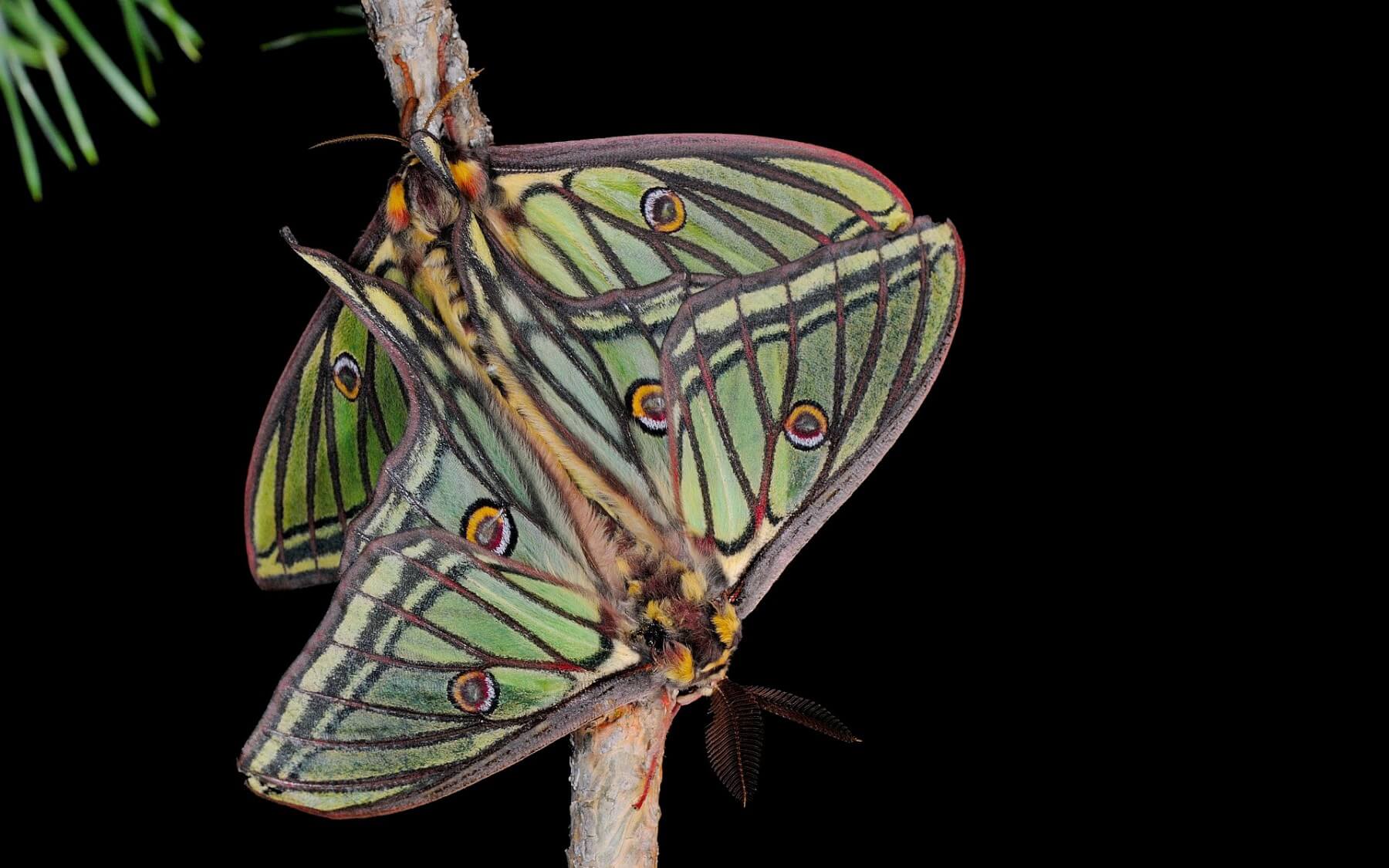 « Si Cynthia aime les grands voyages, Isabelle préfère rester au pied de son pin » , résume Paul André Pichard. Graellsia isabellae est aussi localement nommée papillon vitrail. C’est un saturnidé comme les paons de nuit, une rareté endémique du sud-ouest de l’Europe. On la trouve en France dans l’ouest des Alpes jusque dans l’Ain. En Suisse, elle est signalée depuis une trentaine d’années dans des zones abruptes et très ensoleillées en Haut-Valais. « L’isabelle est très difficile à observer dans la nature car elle est nocturne et peu attirée par la lumière artificielle. » De plus, les adultes incapables de se nourrir ne vivent que quelques jours après la reproduction printanière. Paul André Pichard a le privilège de photographier régulièrement cette espèce prestigieuse.