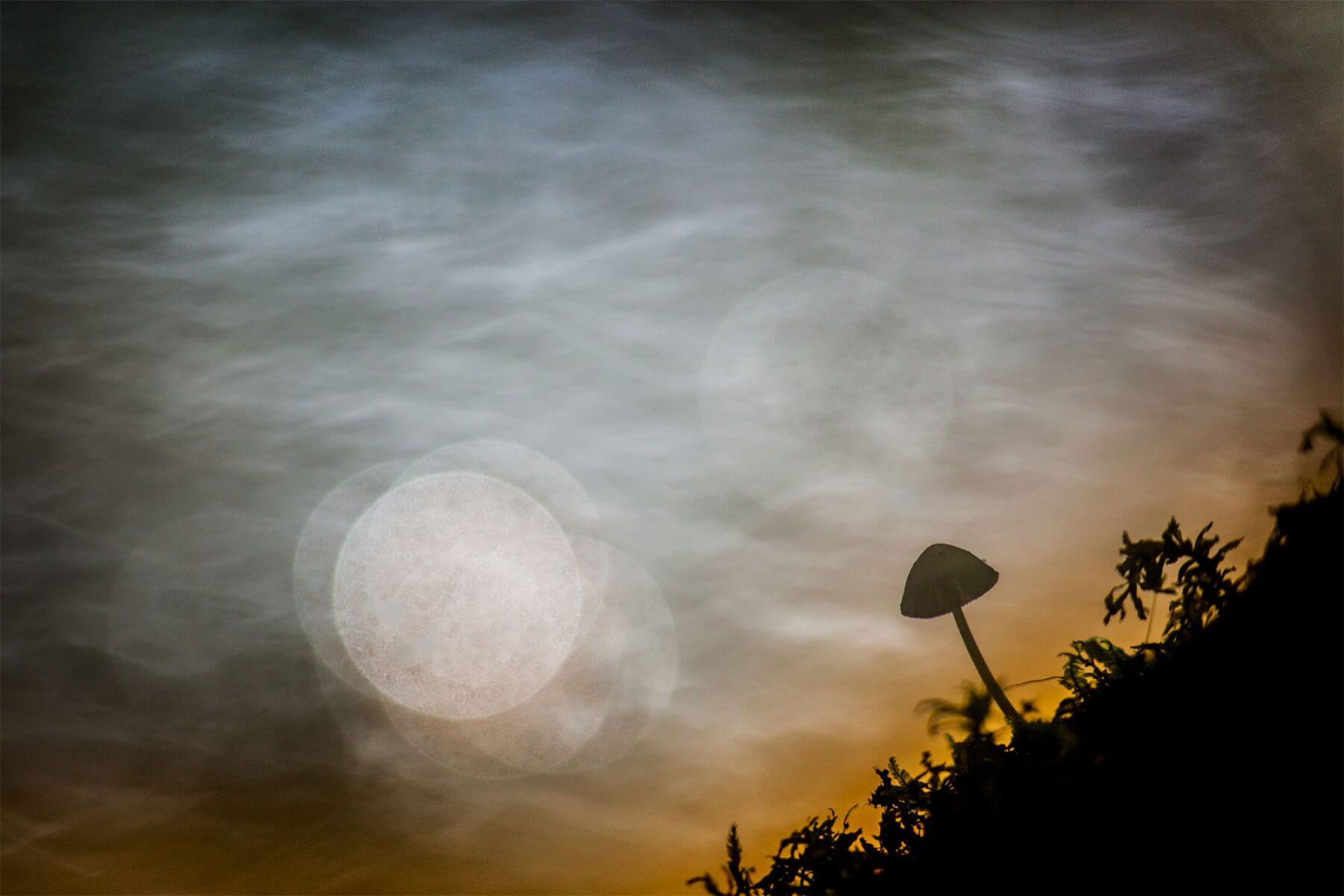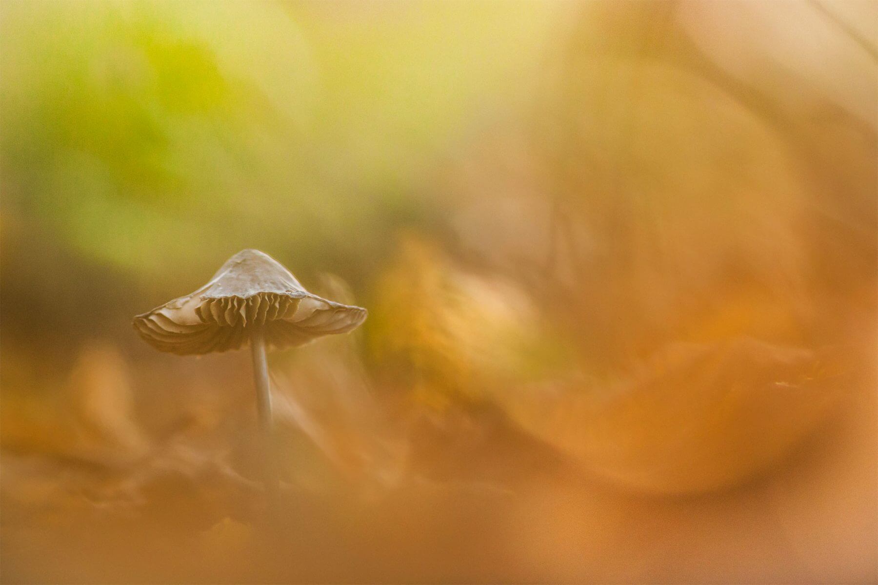 L’air est frais, mais chargé de mon matériel photo je me réchauffe dès les premiers pas sur le tapis rouge de feuilles humides. Les rayons encore rasants révèlent des formes énigmatiques adossées à une souche. Emerveillé par ces lutins, je m’approche. Quelques centimètres de haut, un chapeau et un pied tout fin : ce sont des champignons saprophytes. Rien d’incroyable au premier abord. En m’allongeant dans le sous-bois, la lumière qui se reflète dans le petit ruisseau de l’arrière-plan m’incite à sortir mon boîtier. Clic-clac. Quelques minutes plus tard, une grenouille rousse quitte bruyamment une ornière inondée dans un chemin forestier. C’est alors que je remarque les reflets de vieux chênes qui se détachent sur fond de flaque. Je tente de composer une image en intégrant à la fois les débris végétaux dans l’eau et le reflet des arbres. Infiniment petit et infiniment grand se rencontrent le temps d’un cliché.