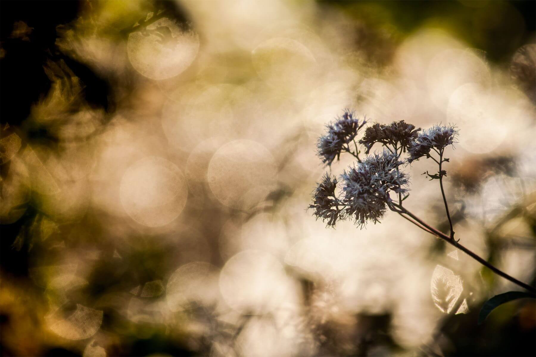 Le paysage change tandis que je gravis une colline. Les chênes majestueux se raréfient au profit des pentes herbeuses et des murets de pierres. Au détour d’un virage, j’aperçois à travers une trouée dans une haie de buis des cardères sauvages qui brillent à contre-jour. J’ai toujours été fasciné par ces plantes à la fois délicates et agressives avec leurs piquants acérés. Leurs inflorescences fanées baignent dans une lumière dorée. Je m’agenouille à leur hauteur et fais la mise au point sur les fleurs à travers les buissons. Le diaphragme grand ouvert estompe la haie et habille mes mannequins épineux de formes mouvantes et mystérieuses. La mauvaise herbe devient une princesse insolite. Il suffit de s’arrêter pour le voir.
