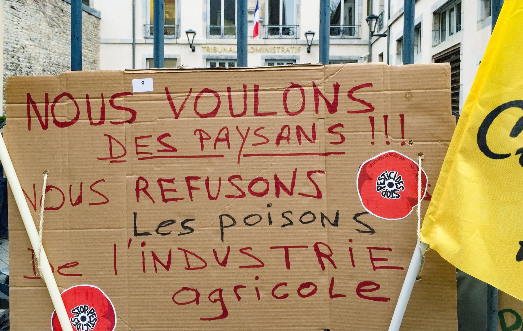 Une foule d’une centaine de personnes est réunie ce 14 novembre devant le tribunal administratif de Besançon. Sous la pluie fleurissent les pétales rouges du mouvement Nous voulons des coquelicots. Parmi les militants, un homme porte l’écharpe bleu-blanc-rouge de la République. Emmanuel Cretin, maire du joli petit village de Nans-sous-Sainte-Anne, doit défendre son arrêté communal anti-pesticides contre le préfet du Doubs, représentant de l’Etat. Le cortège suit l’élu déterminé jusque dans la salle d’audience, où les arguments des deux parties sont échangés. « Je ne me fais pas trop d’illusions, mon arrêté sera probablement suspendu par le tribunal, comme tant d’autres avant celui-ci », se désole Emmanuel Cretin. Ses craintes sont confirmées deux jours plus tard, lorsque le jugement suspend l’application du texte interdisant l’usage de tout produit phytosanitaire sur les 885 ha de cette commune où coule le Lison, entouré de grandes falaises calcaires.
