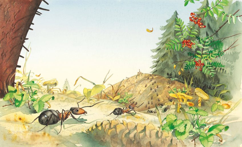 Sous les lactaires salmonicolores, une troupe d'ouvrières caracole entre les herbes et se dirige vers son logis. Les mois précédents, elles ont nourri leurs reines et le couvain : œufs, larves et nymphes dans leur cocon. Maintenant, plus la température chute, plus les corps s'engourdissent. Il est temps de se mettre à l'abri.