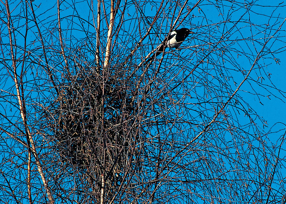 Contrairement à l’écureuil, la pie construit son nid au haut de l’arbre, en situation bien exposée. Il est composé principalement de branches mortes et on peut y voir à travers. Il arrive que l’écureuil squatte un nid abandonné, mais dans ce cas il le consolide, le surélève et l’épaissit.
